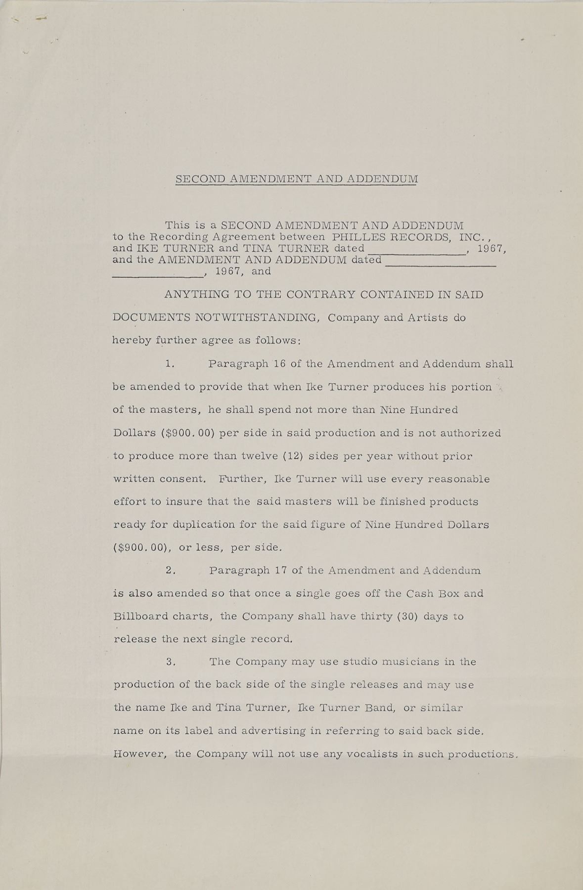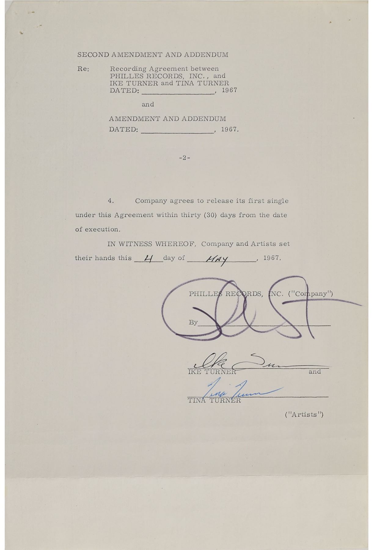 DS, two pages, 8.5 x 13, May 4, 1967. A "Second Amendment and Addendum" document related to their recording agreement, in part: "When Ike Turner produces his portion of the masters, he shall spend not more than Nine Hundred Dollars ($900.00) per side in said production…Further, Ike Turner will use every reasonable effort to insure that the said masters will be finished products ready for duplication." Signed at the conclusion by Phil Spector, Ike Turner, and Tina Turner. In fine condition, with staple holes to corners.