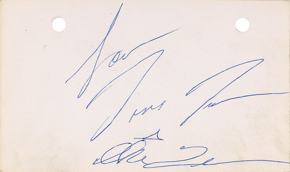 Vintage ballpoint signatures, “Love, Tina Turner” and “Ike Turner,” on an off-white 5 x 3 card. Ballpoint notation to reverse indicates signatures were received on August 24, 1975. In fine condition, with two punch holes to the top.