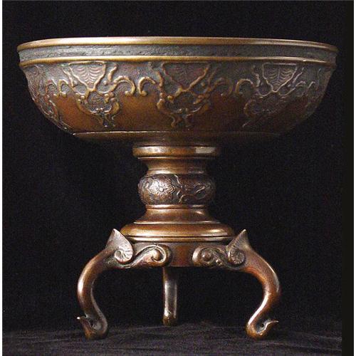 Elegant Japanese bronze footed artifact, possibly an Ikebana vase, decorated with three-dimensional stylized flowers and tendrils in the Art Nouveau style. Interior bowl has center ring, probably meant to place a flower holder. This is a good example of how, in the early 1900's, the Japanese adopted the "new look" of Art Nouveau to appeal to western markets. It is marked on the underside with Japanese characters, most likely the artist's or manufacturer's signature, and the English text: "Made in Japan" which dates it as a post World War I piece. In good condition, as shown. Additional photos available upon request. Please send us an email before bidding with your state, country and zip code so we can estimate shipping charges to your location.