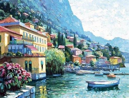 A Lakeside setting in Italy, this is a limited edition, signed and numbered serigraph on paper by Howard Behrens, with COA. 26 x 32