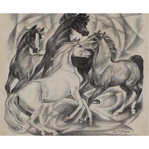 7717 Ila Mae McAfee (1897-1995) Graphite 4 Horses Signed lower left 8" x 9" Provenance: Artist's Family Member