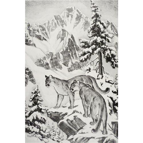 Ila McAfee (1897 -1995), Litho, Mountain Lions, 13 1/2" x 9", Signed lower left.