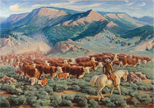Ila Mae McAfee (1897-1995). Hereford Herd. 25" x 36" oil on canvas. Signed lower right. (est $8,000-10,000)