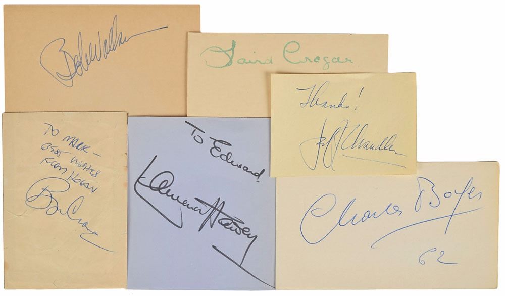 Group of six ink signatures of actors on slips and cards of various sizes, including: Charles Boyer, Laurence Harvey, Robert Walker, Laird Cregar, Bob Crane (ins), and Jeff Chandler. In overall very good to fine condition, with overall creasing to the mounted Crane signature.