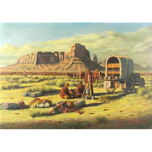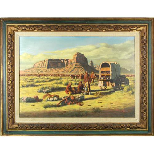 Illegible, Oil on Canvas, Covered Wagon Scene, 20" x 28", signed lower right
