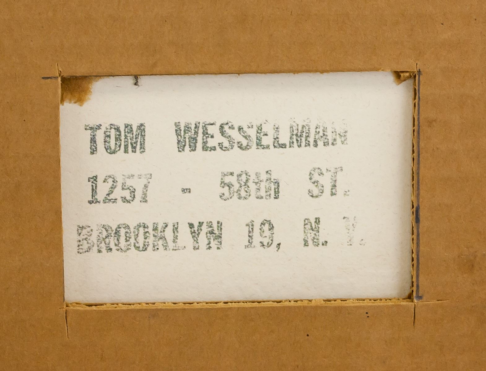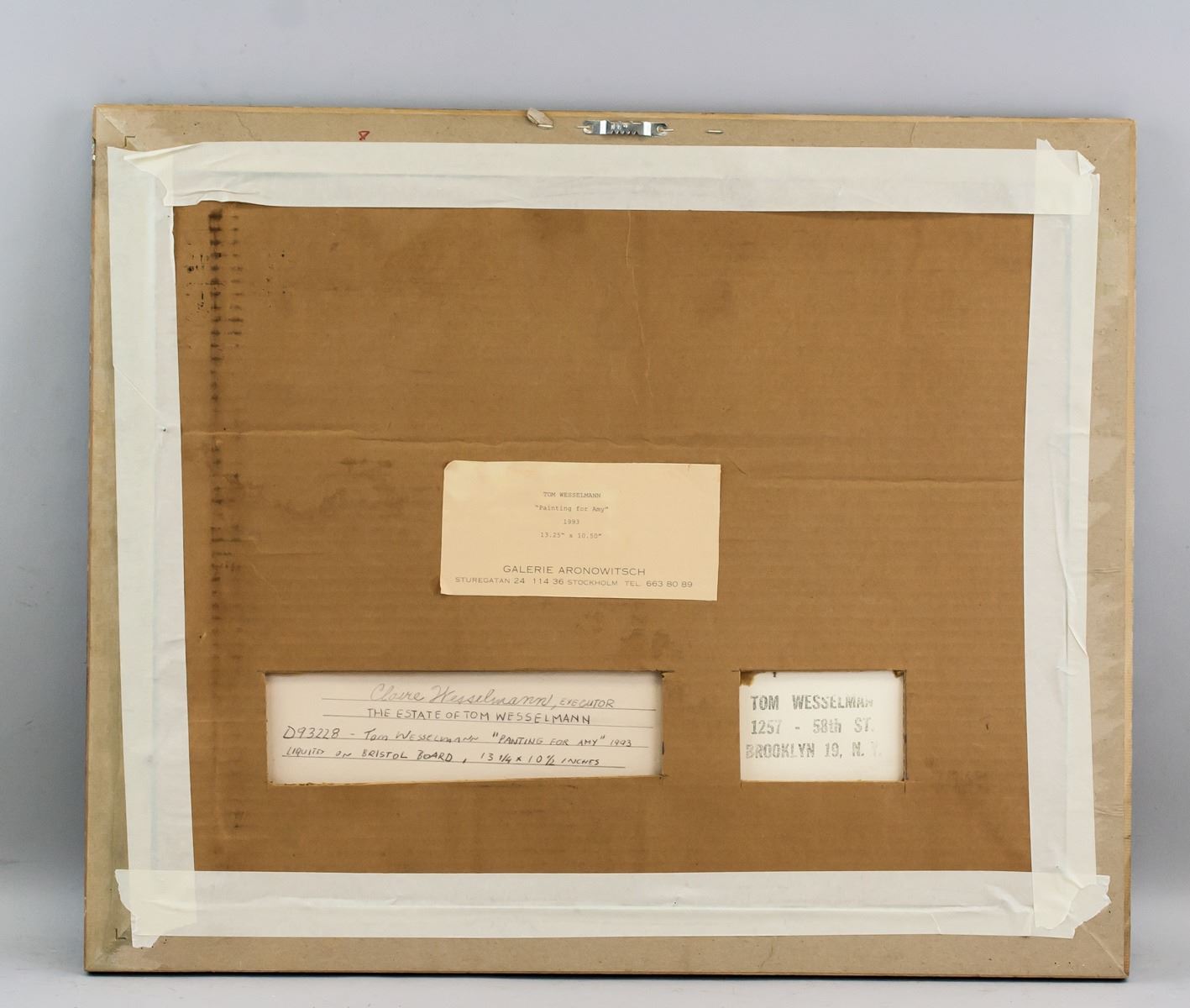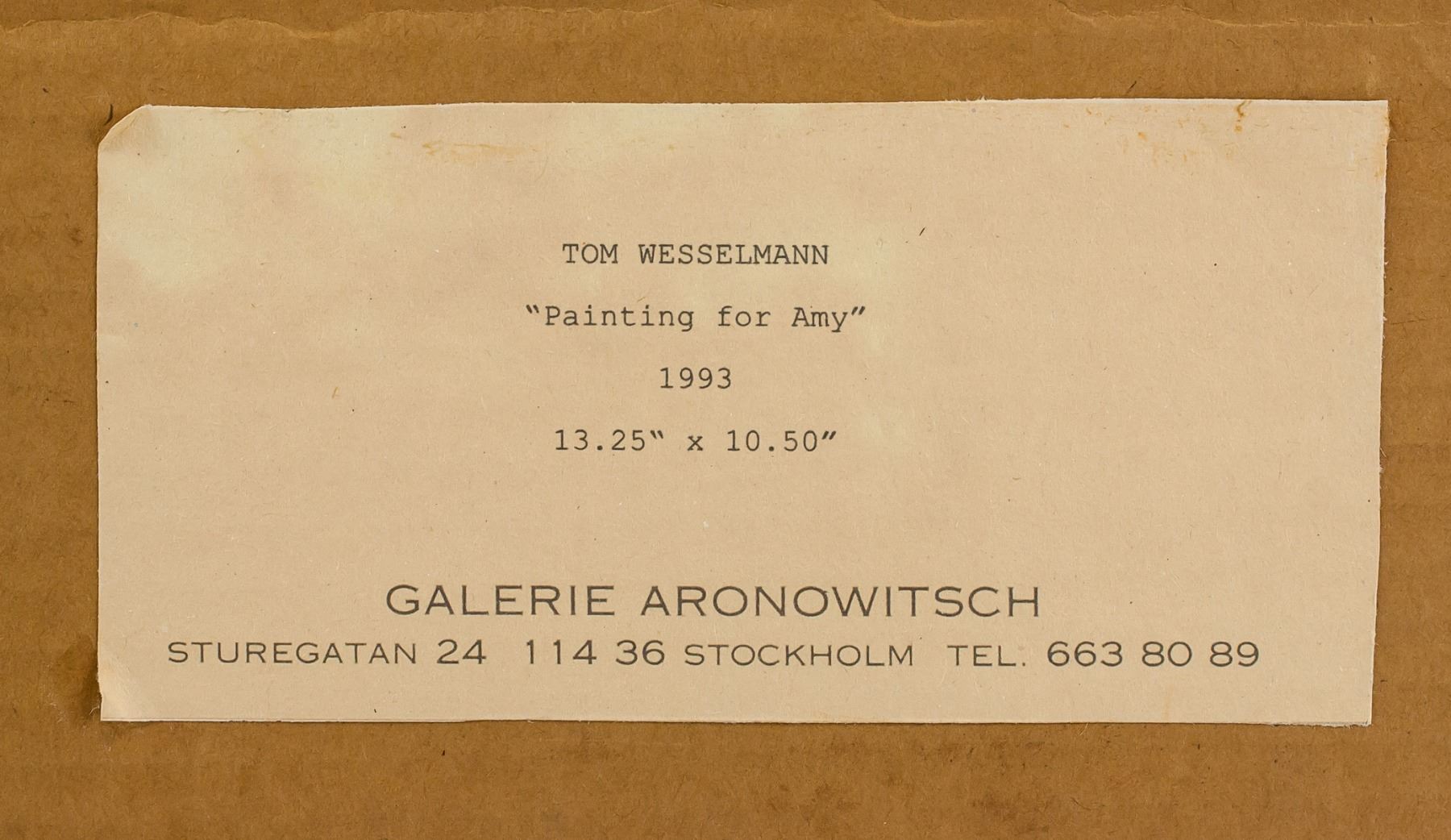 Acrylic on board, framed. Featuring a nude portrait. Signed Illegibly on the lower right corner. Label affixed to verso inscribed TOM WESSELMANN / "Painting for Amy" / 1993 / "13.25 x 10.50." GALERIE ARONOWITSCH / STUREGATAN 24 114 36 STOCKHOLM TEL. 663 80 89. On verso also inscribed CLaire Wesselmann, EXECUTOR / THE ESTATE OF TOM WESSELMANN / D93228 - Tom Wesselmann "PAINTING FOR AMY" 1993 / LIQUITEX ON BRISTOL BOARD, 13 1/4 x 10 1/2 INCHES. Stamped TOM WESSELMAN 1257 - 58th ST. BROOKLYN 19, N. Y. on verso. 26 x 34 cm (10.5 x 13.25 in). Frame: 48 x 58.5 cm (19 x 23 in). PROVENANCE: Private American collection