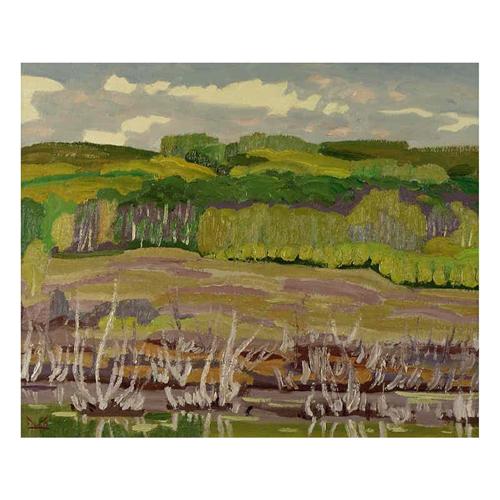 [Canadian ASA, RCA 1905-1985] POND IN HILLS BELOW LEIGHTON CENTRE; 1980 Oil on board 16 x 20 in. Monogrammed; Signed, titled & dated.