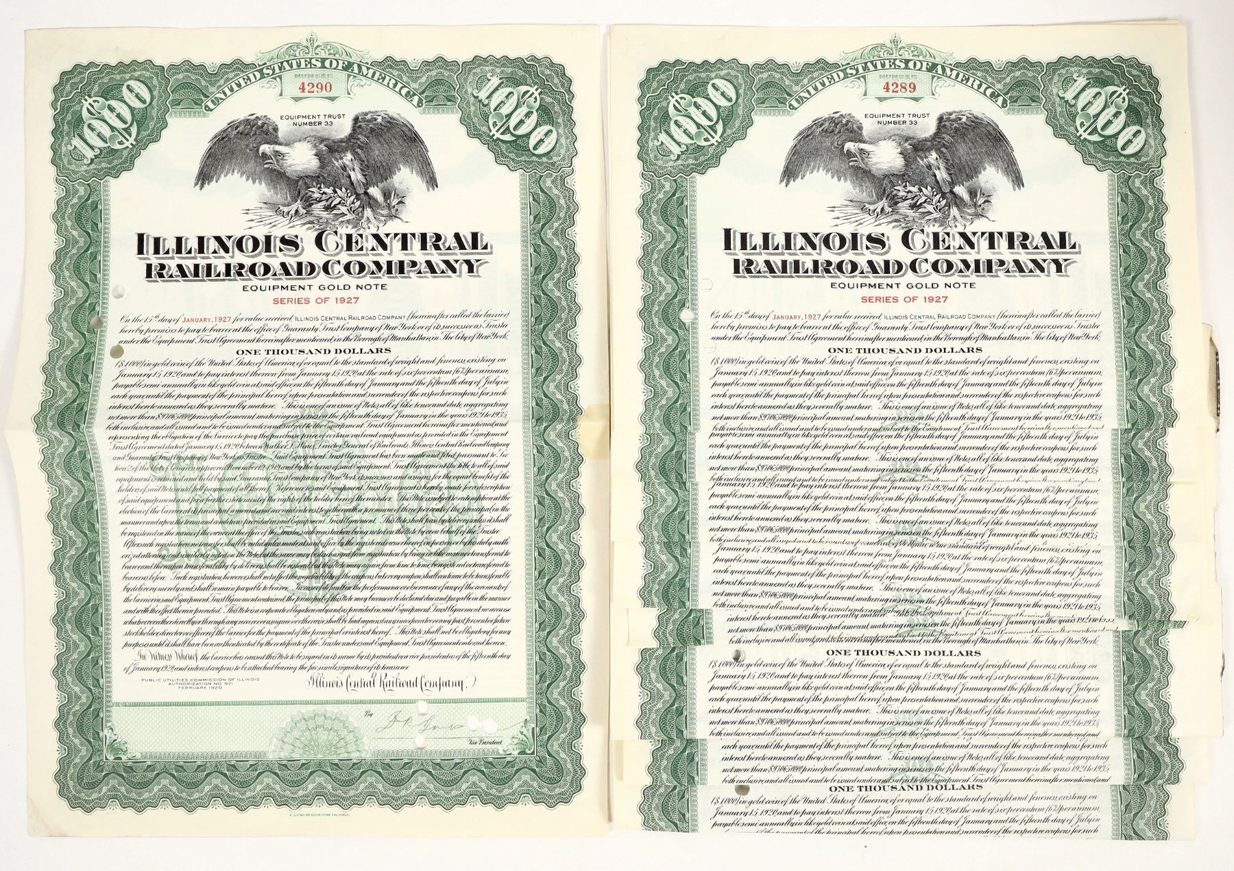Lot of 15 Equipment Trust Gold Notes $1000 from the Illinois Central Railroad Company. Green ink, nasty eagle vignette.