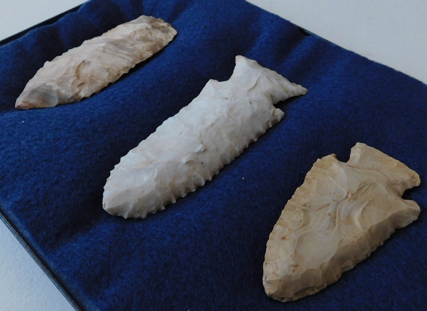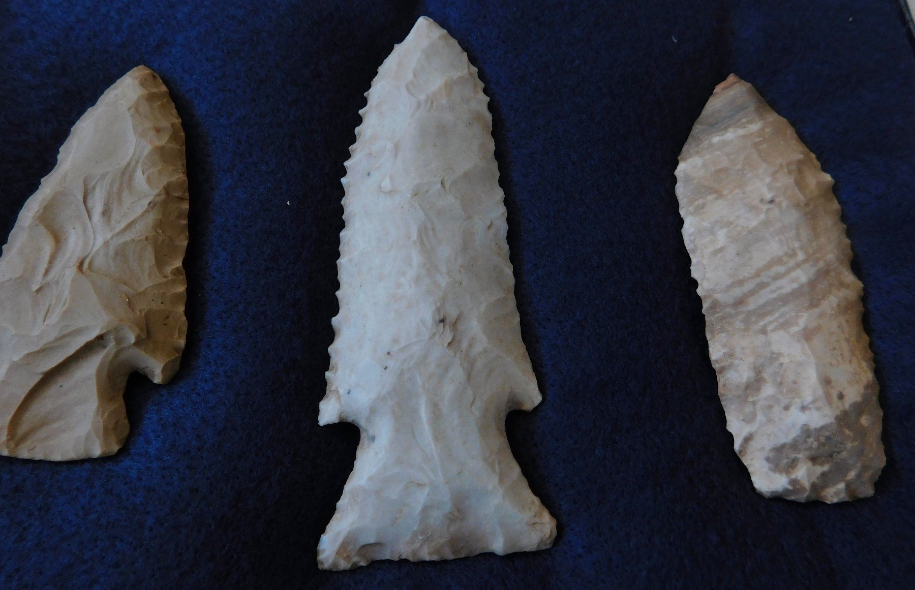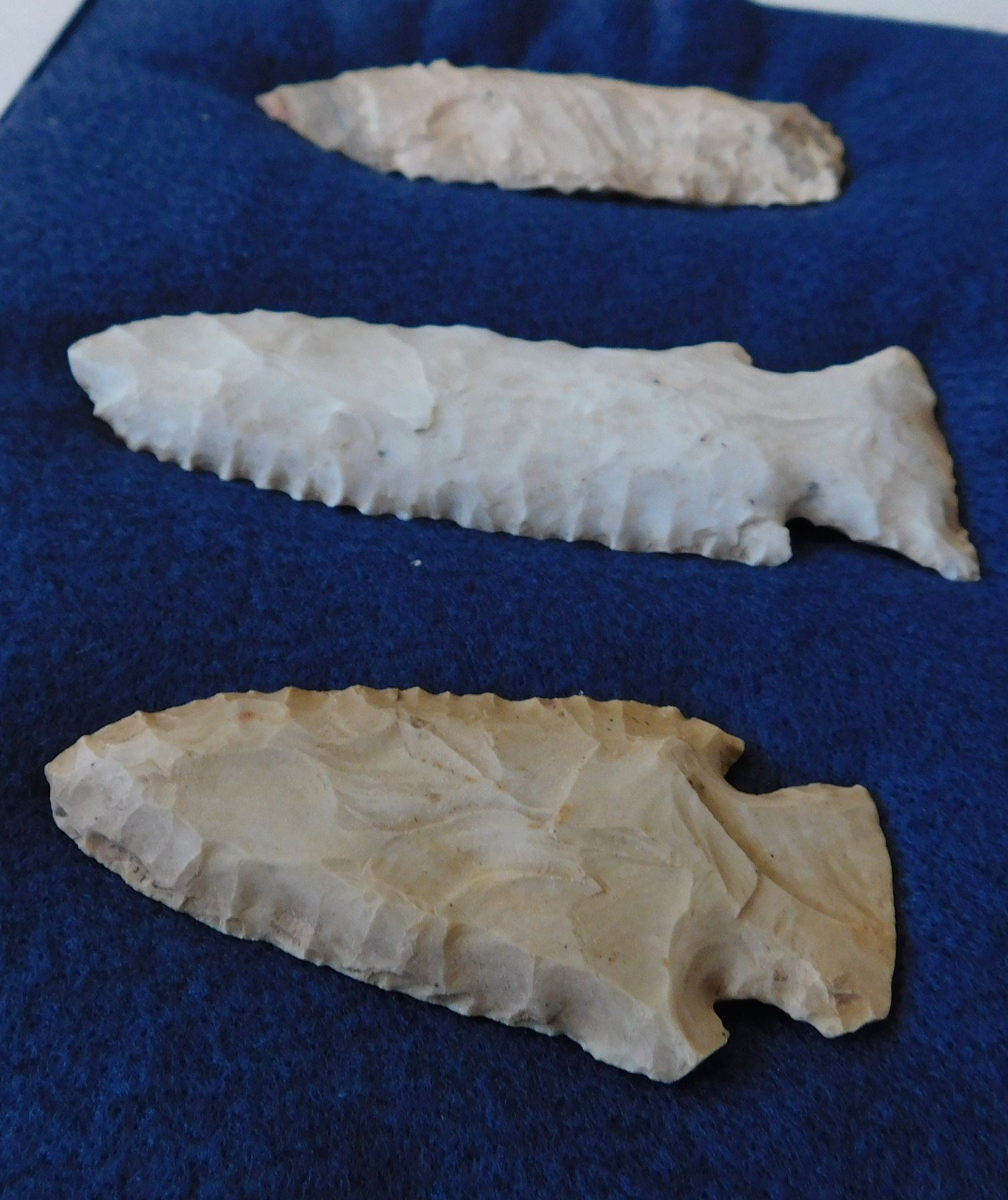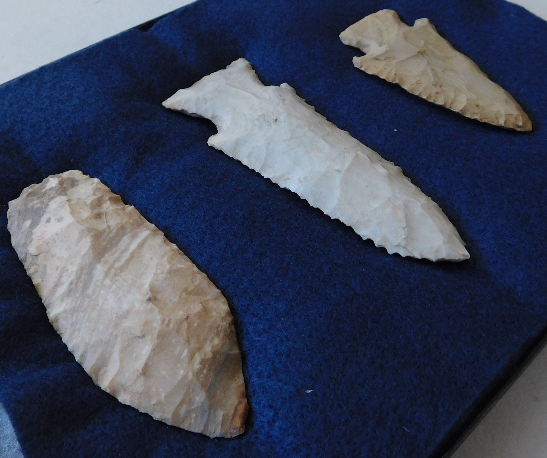 Illinois Flint Collection, archaic period. Made of flint and chert, the items measure from 2 7/8" to 3 15/16". Found near Quincy, Illinois. Frame not included. Condition: As found, see images. Shipping: $23.50 w/insurance and signature.