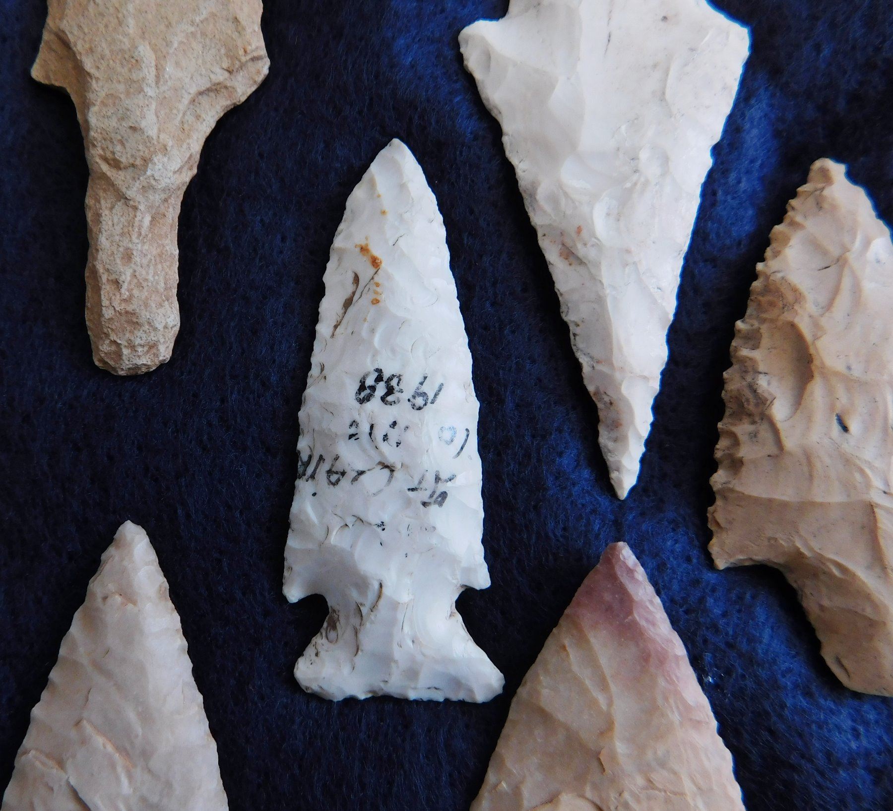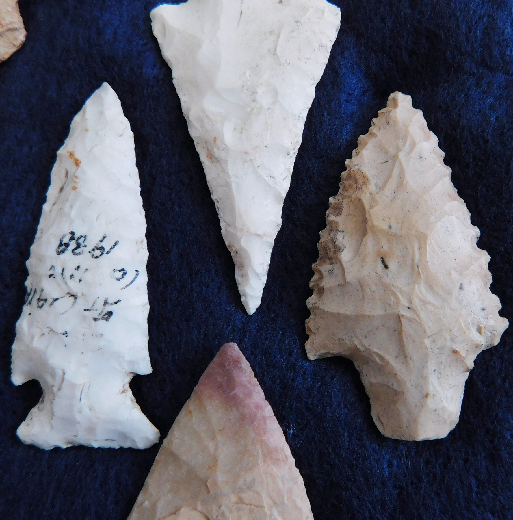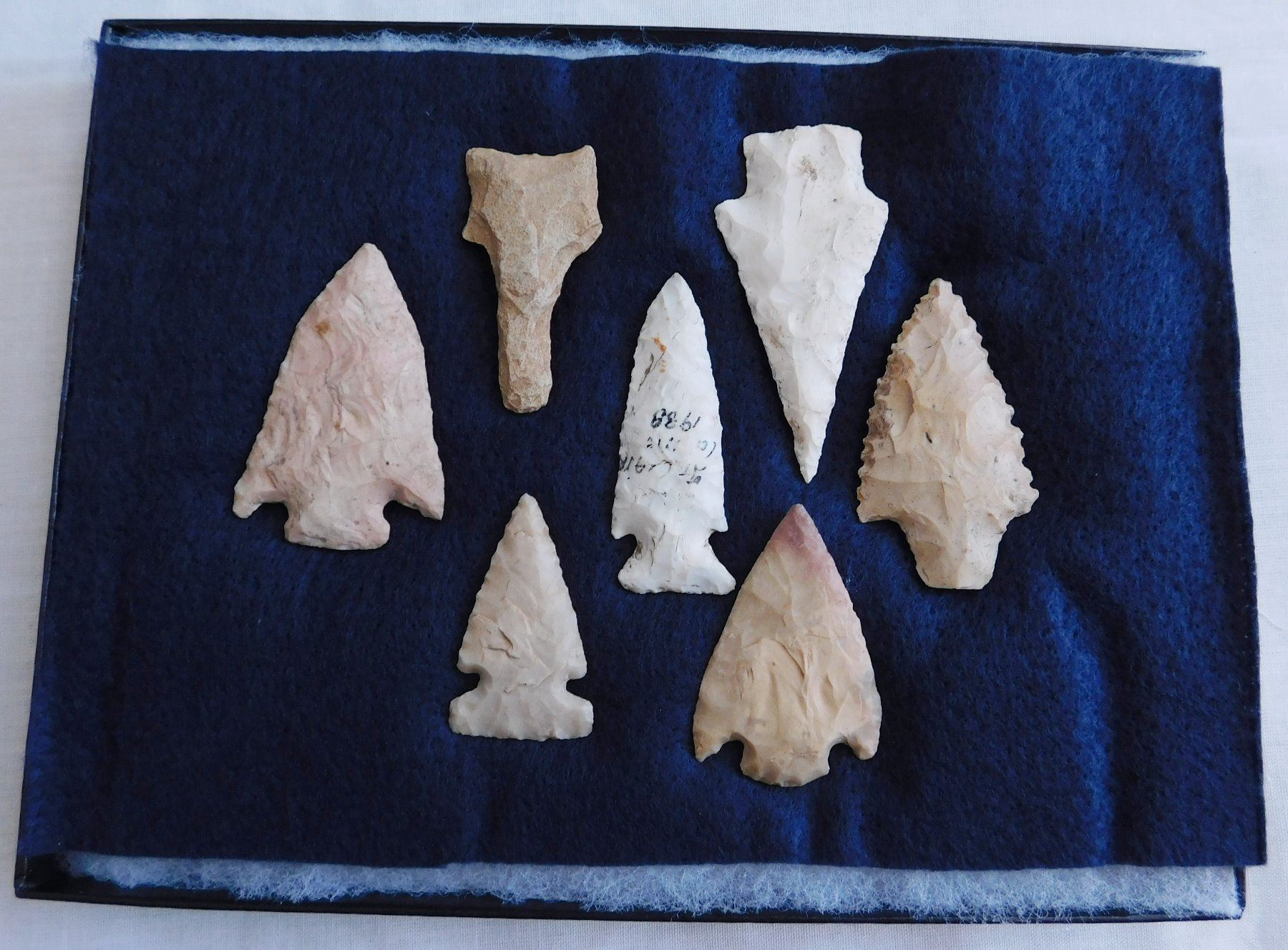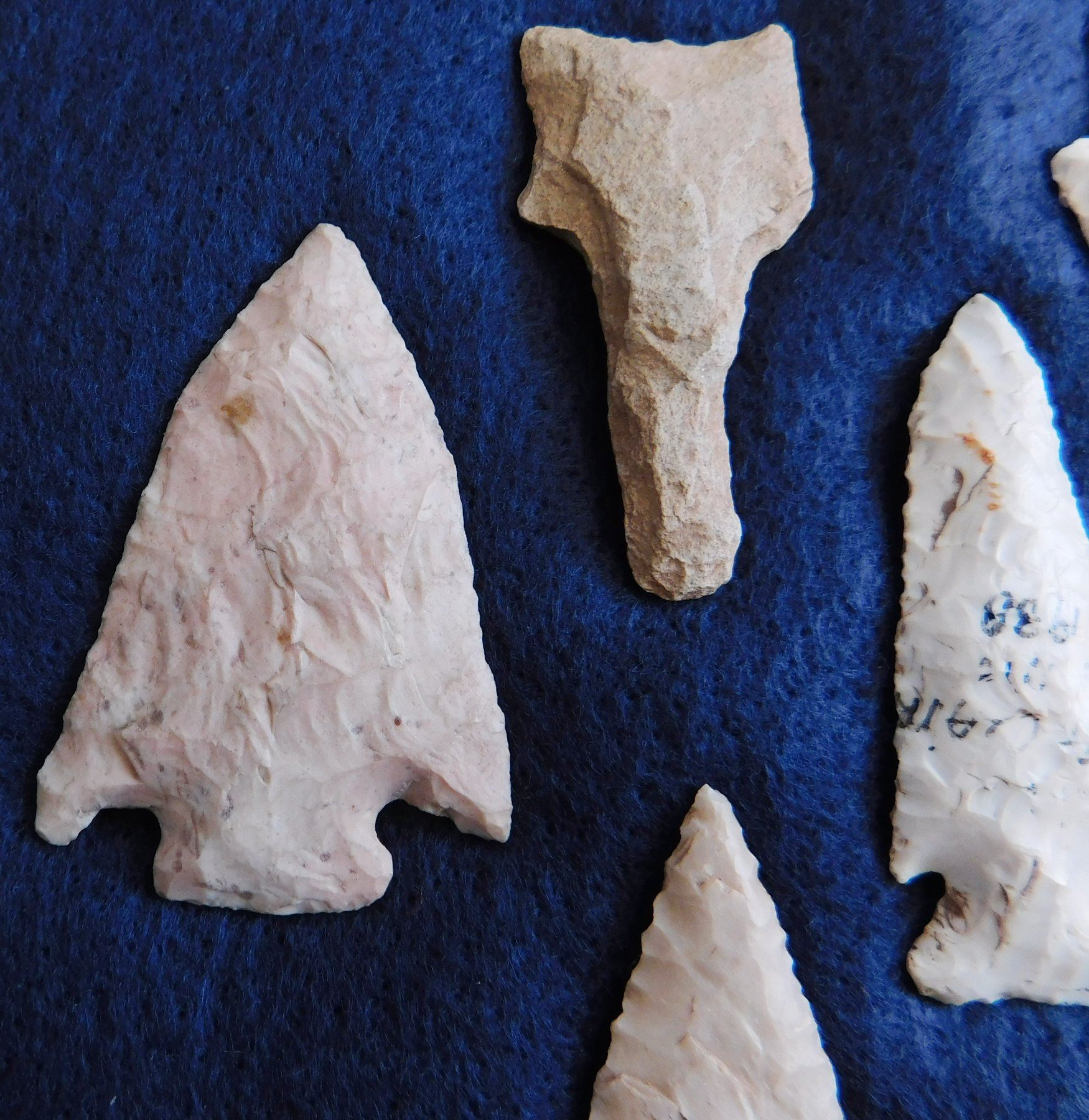 Illinois Flint Collection, pre-historic items. Made of chert, the items measure from 1.75" to 2.5" long. Adams County, Illinois. Frame not included. Condition: As found, see images. Shipping: $16.50 w/insurance and signature.
