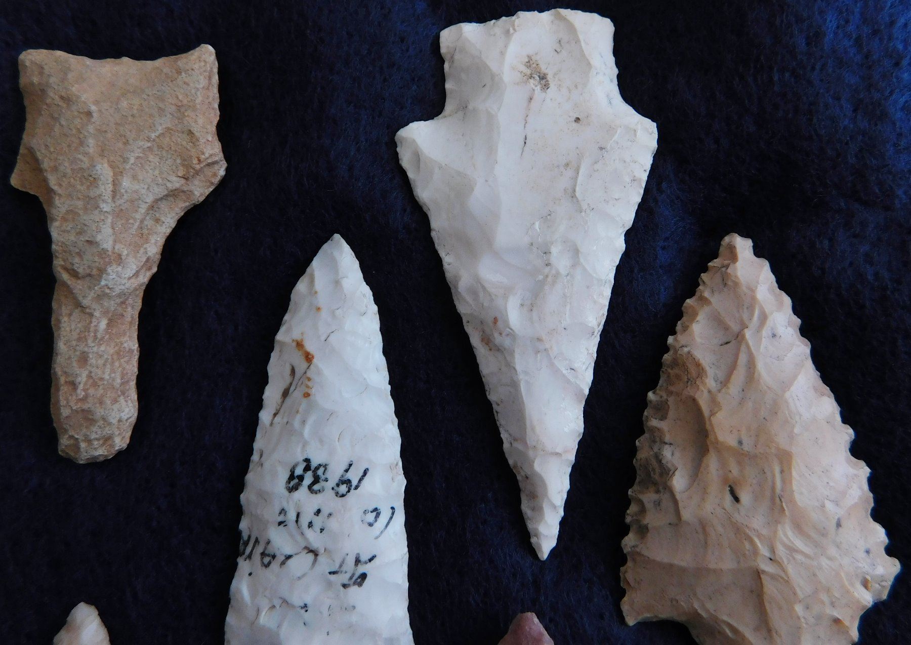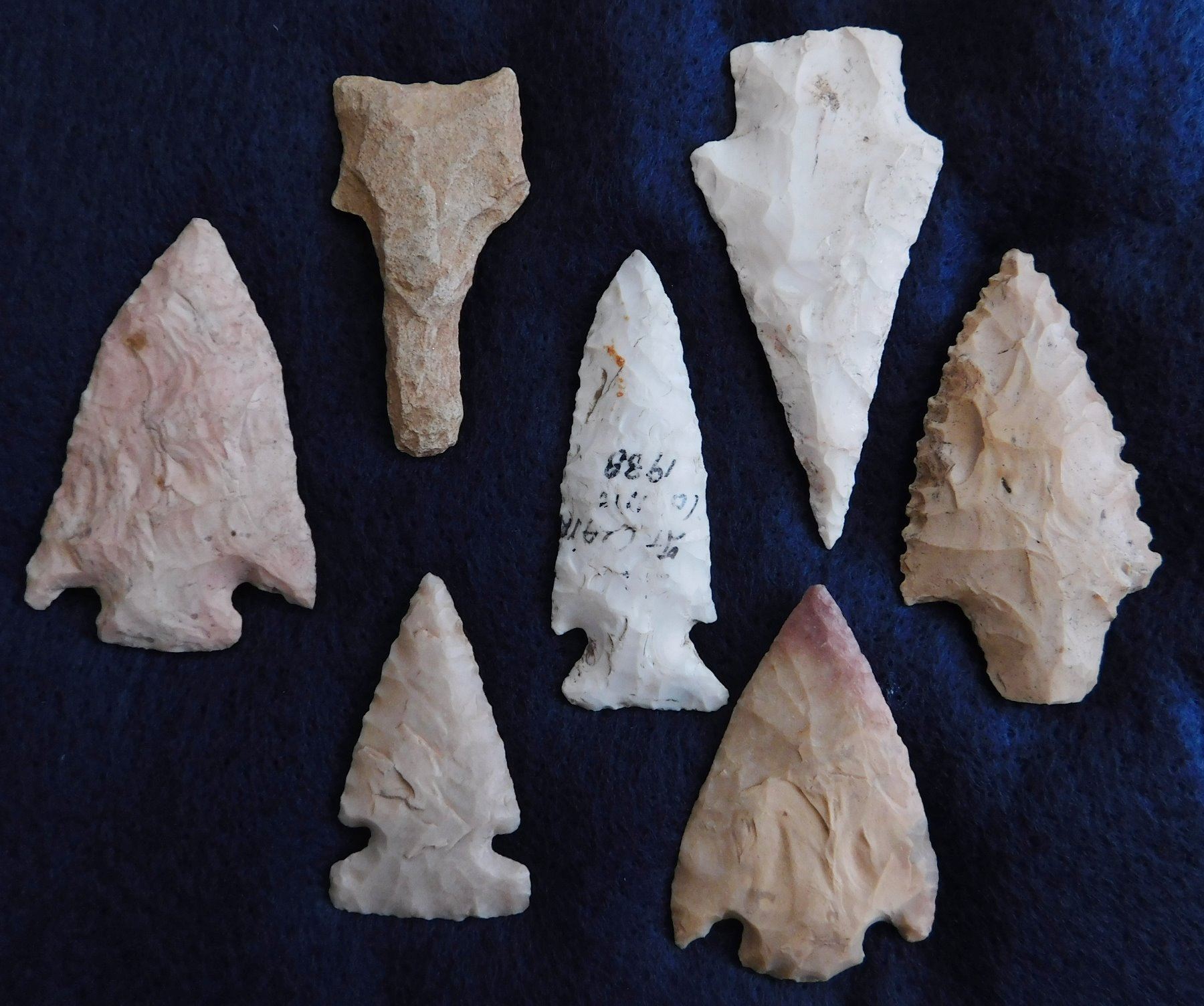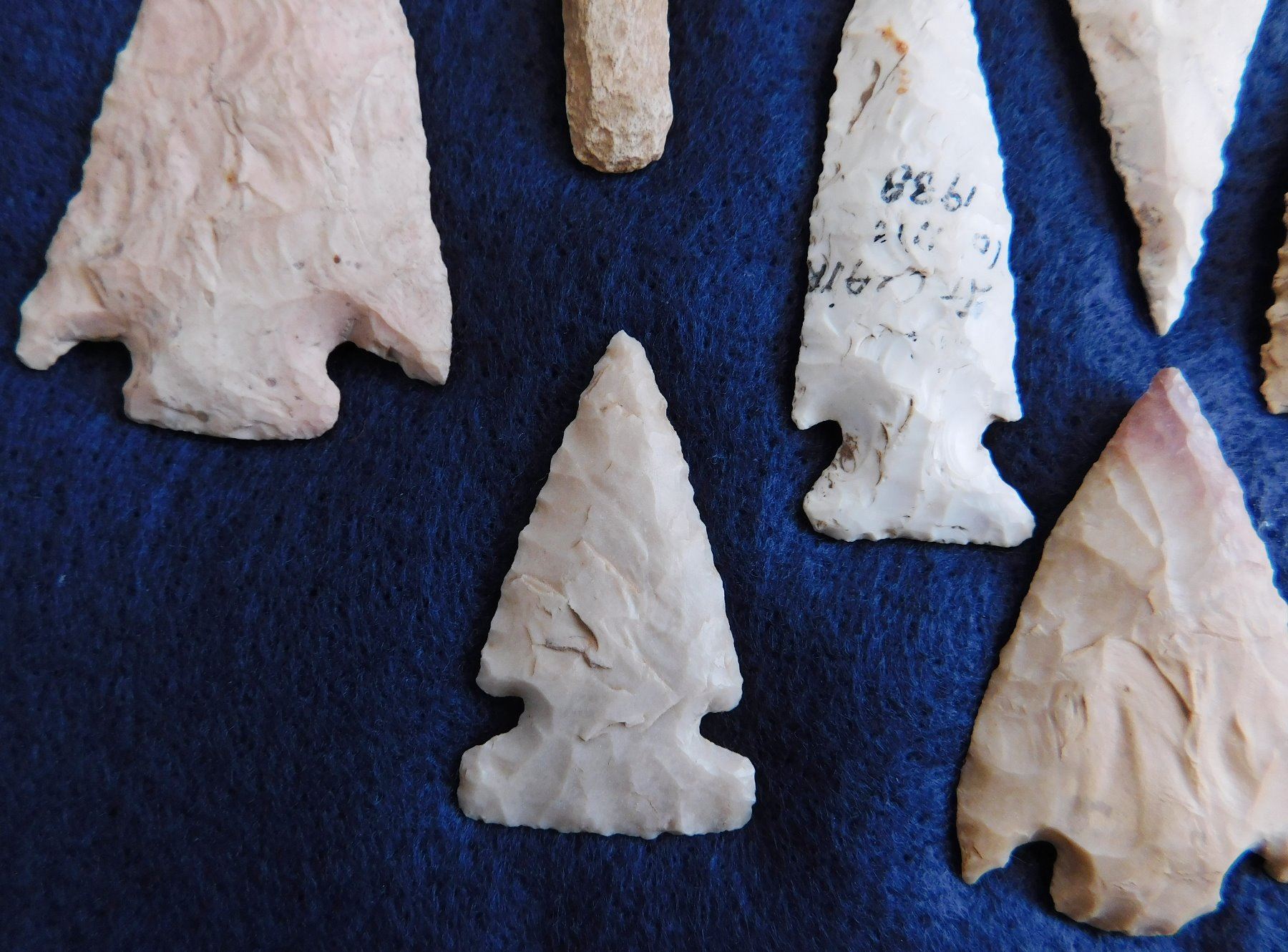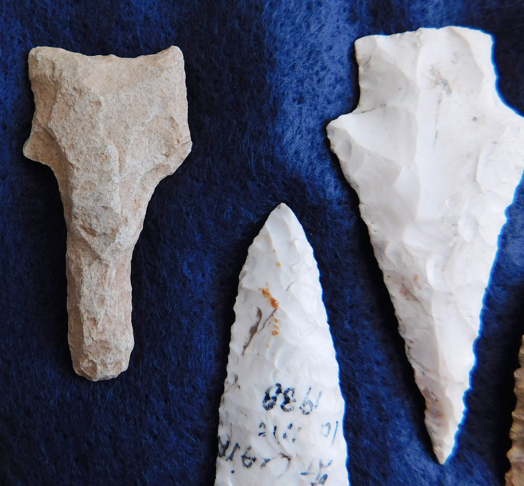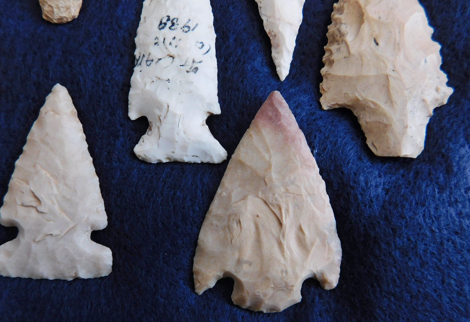 Illinois Flint Collection, pre-historic items. Made of chert, the items measure from 1.75" to 2.5" long. Adams County, Illinois. Frame not included. Condition: As found, see images. Shipping: $16.50 w/insurance and signature.