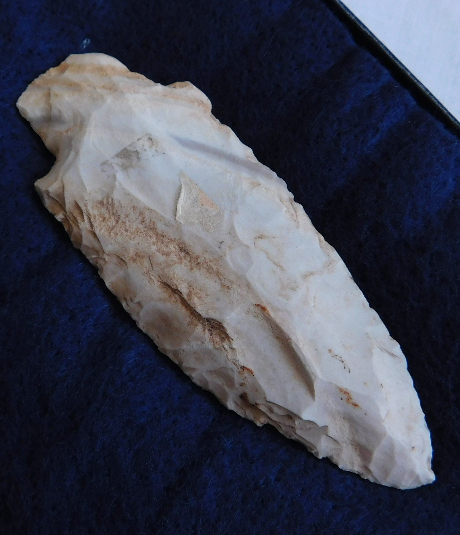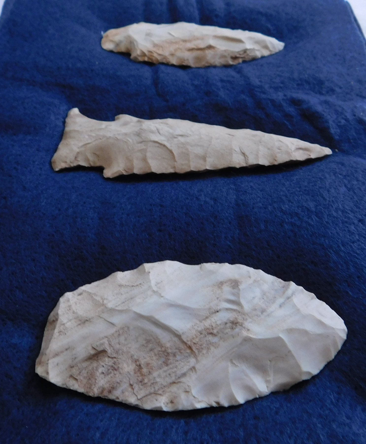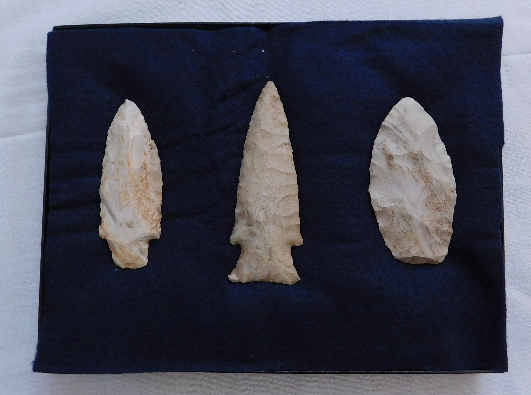 Illinois Flint Collection, pre-historic items. Made of chert, the items measure from 3" to 3.5" long. Adams County, Illinois. Frame not included. Condition: As found, see images. Shipping: $18.00 w/insurance and signature.