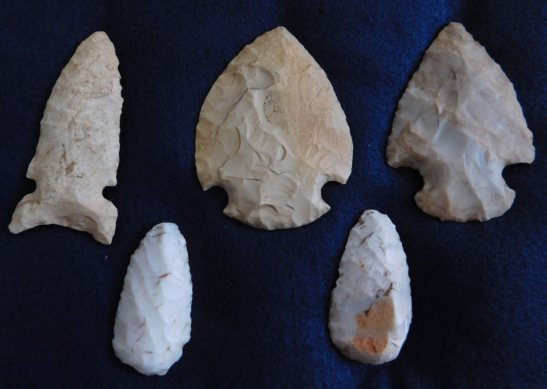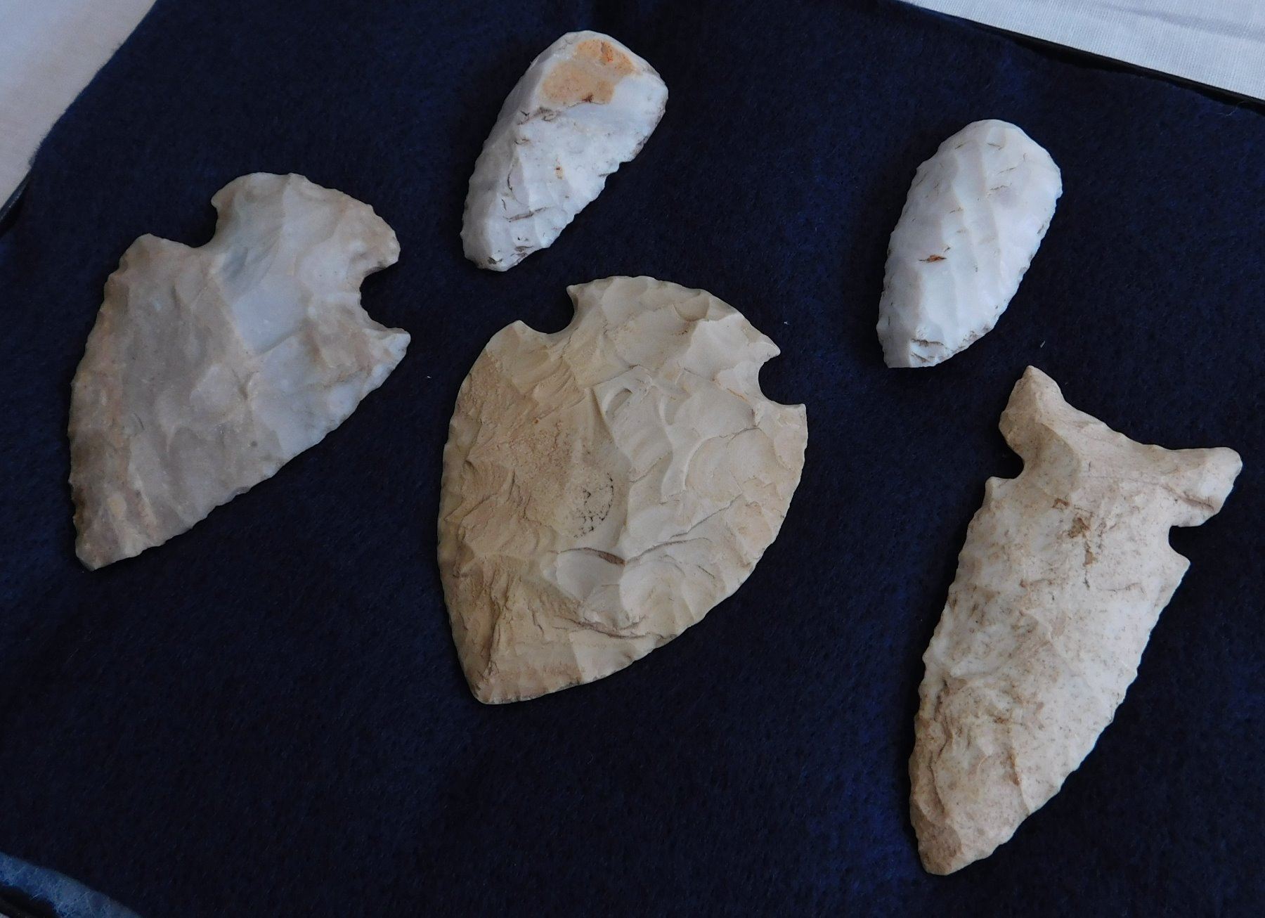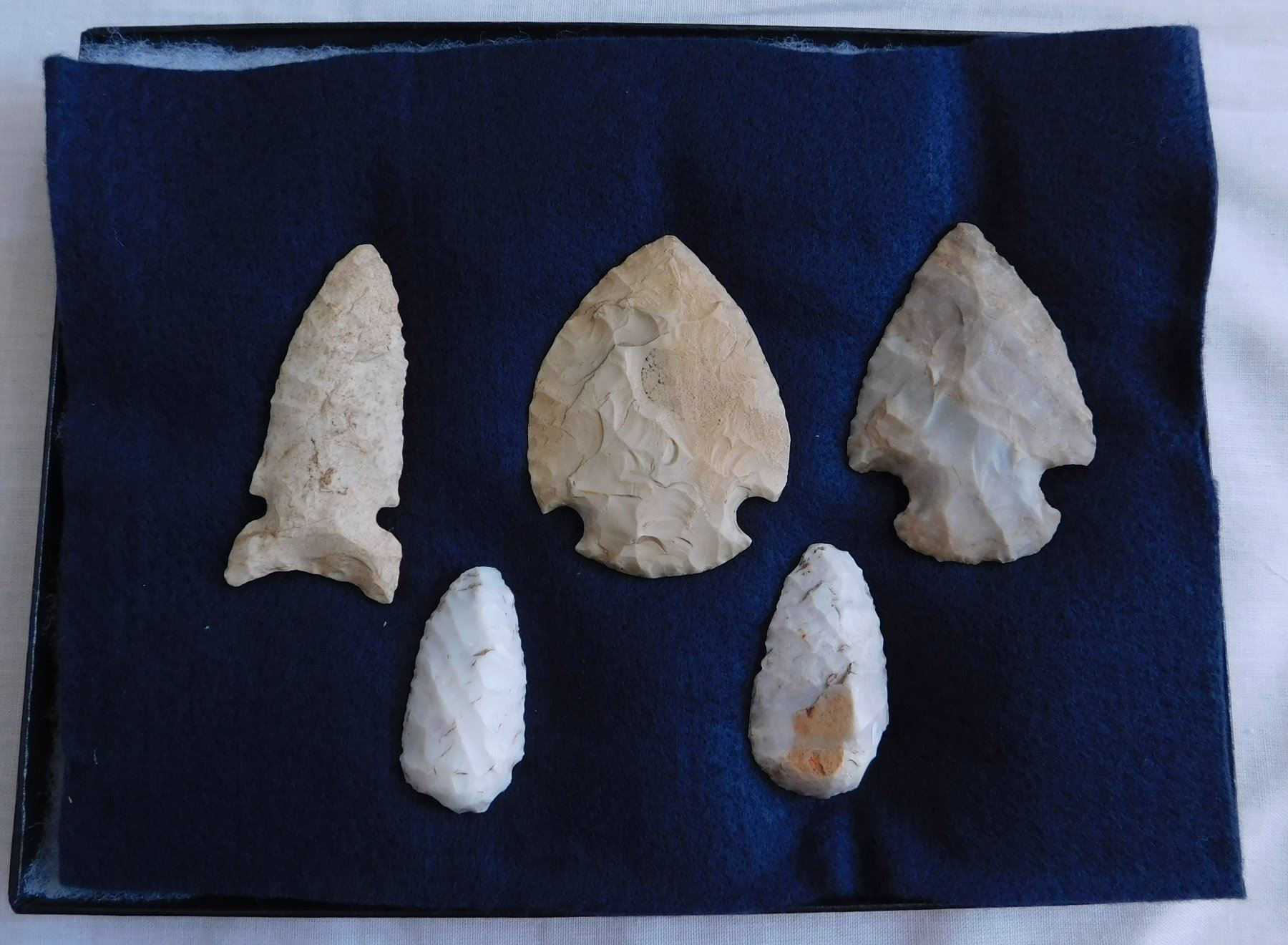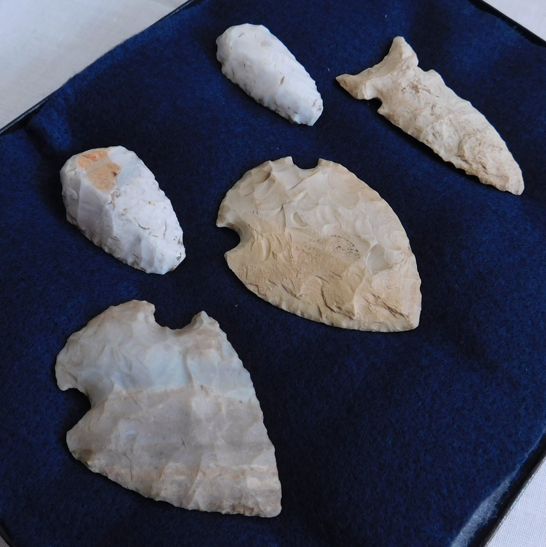 Illinois Flint Collection, pre-historic items. Made of chert, the items measure from 1.5" to 2.5" long. Adams County, Illinois. Frame not included. Condition: As found, see images. Shipping: $18.50 w/insurance and signature.