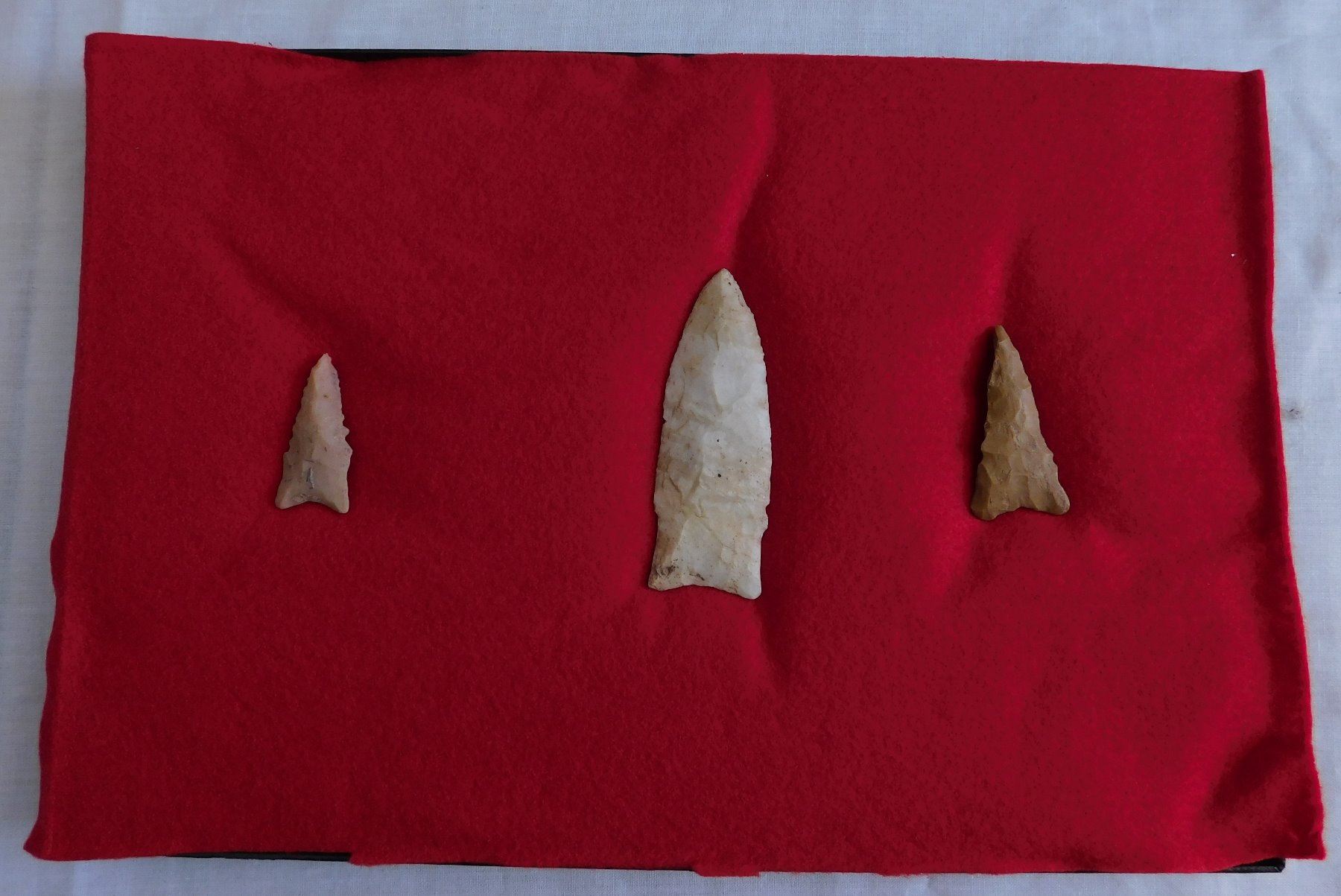 Illinois Flint Collection, pre-historic items. Made of chert, the items measure from 1.5" to 3.5" long. Adams County, Illinois. Frame not included. Condition: As found, see images. Shipping: $16.50 w/insurance and signature.