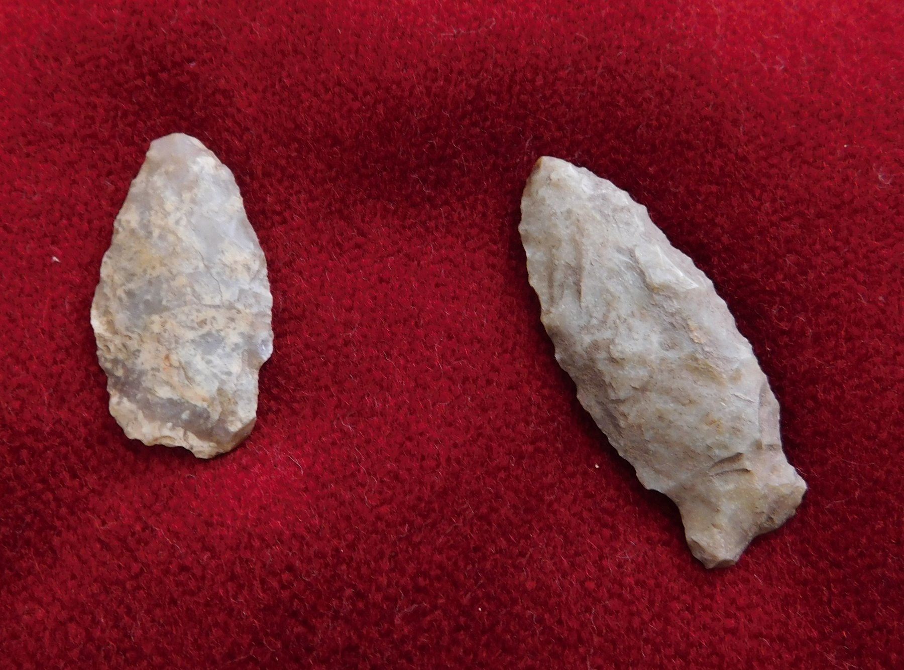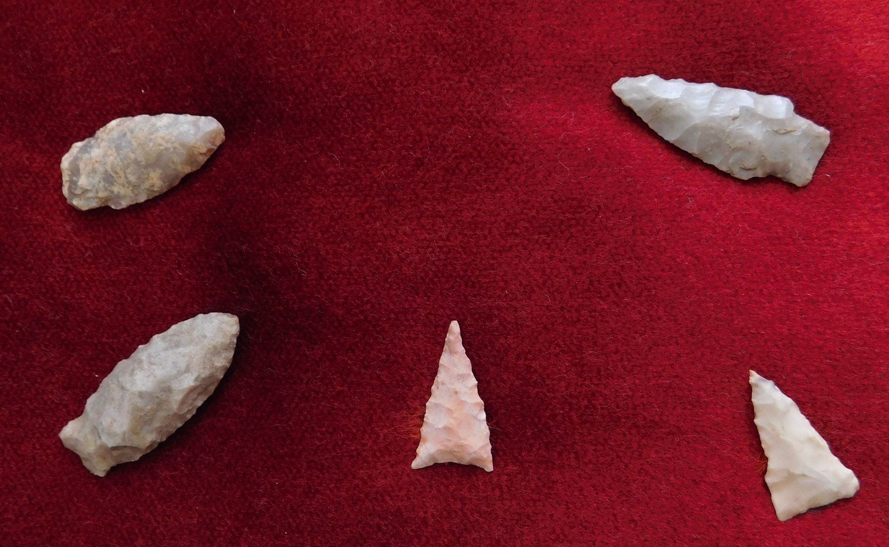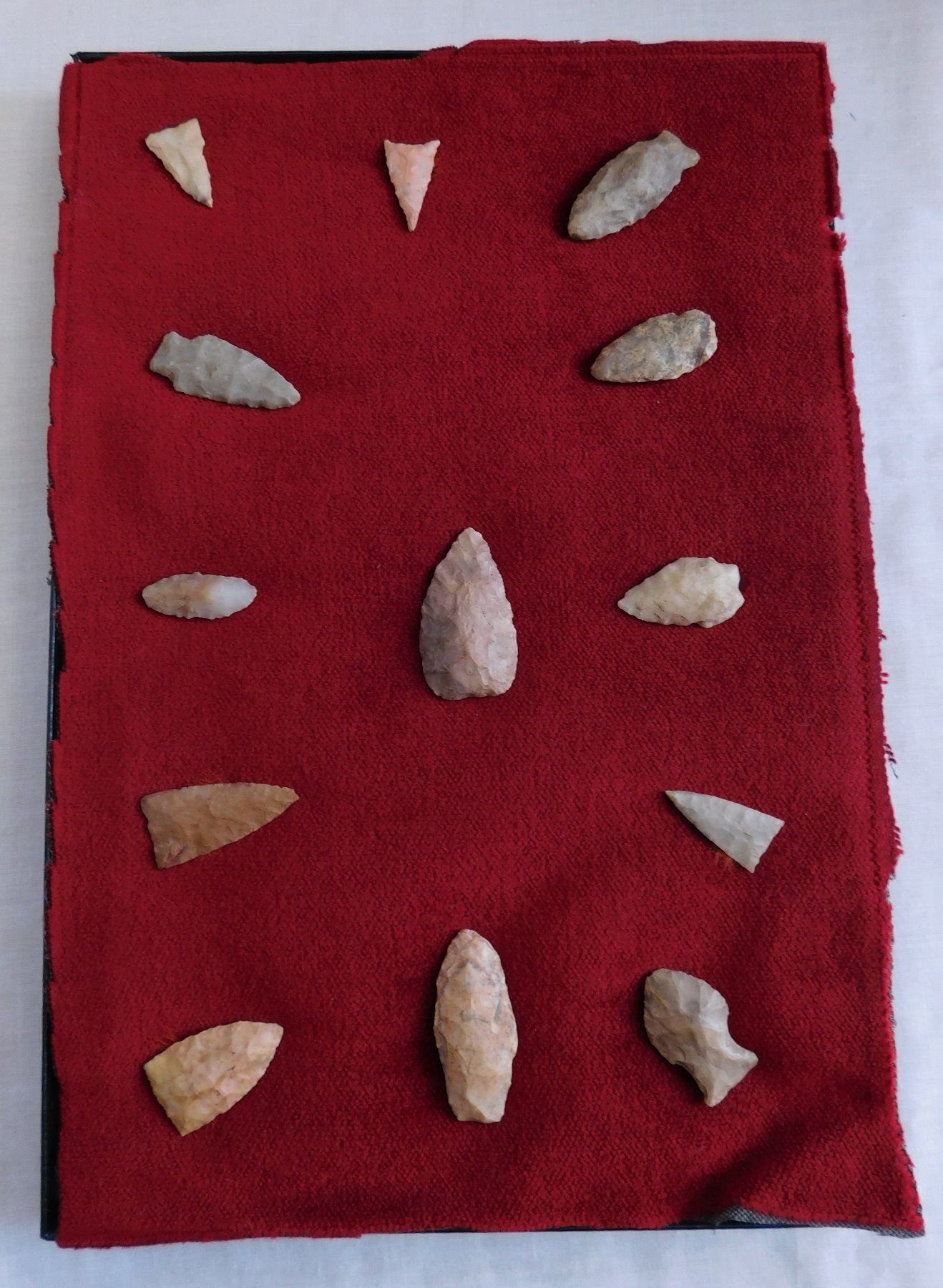 Illinois Flint Collection, pre-historic items. Made of chert, the items measure from 1" to 2" long. Adams County, Illinois. Frame not included. Condition: As found, see images. Shipping: $18.00 w/insurance and signature.