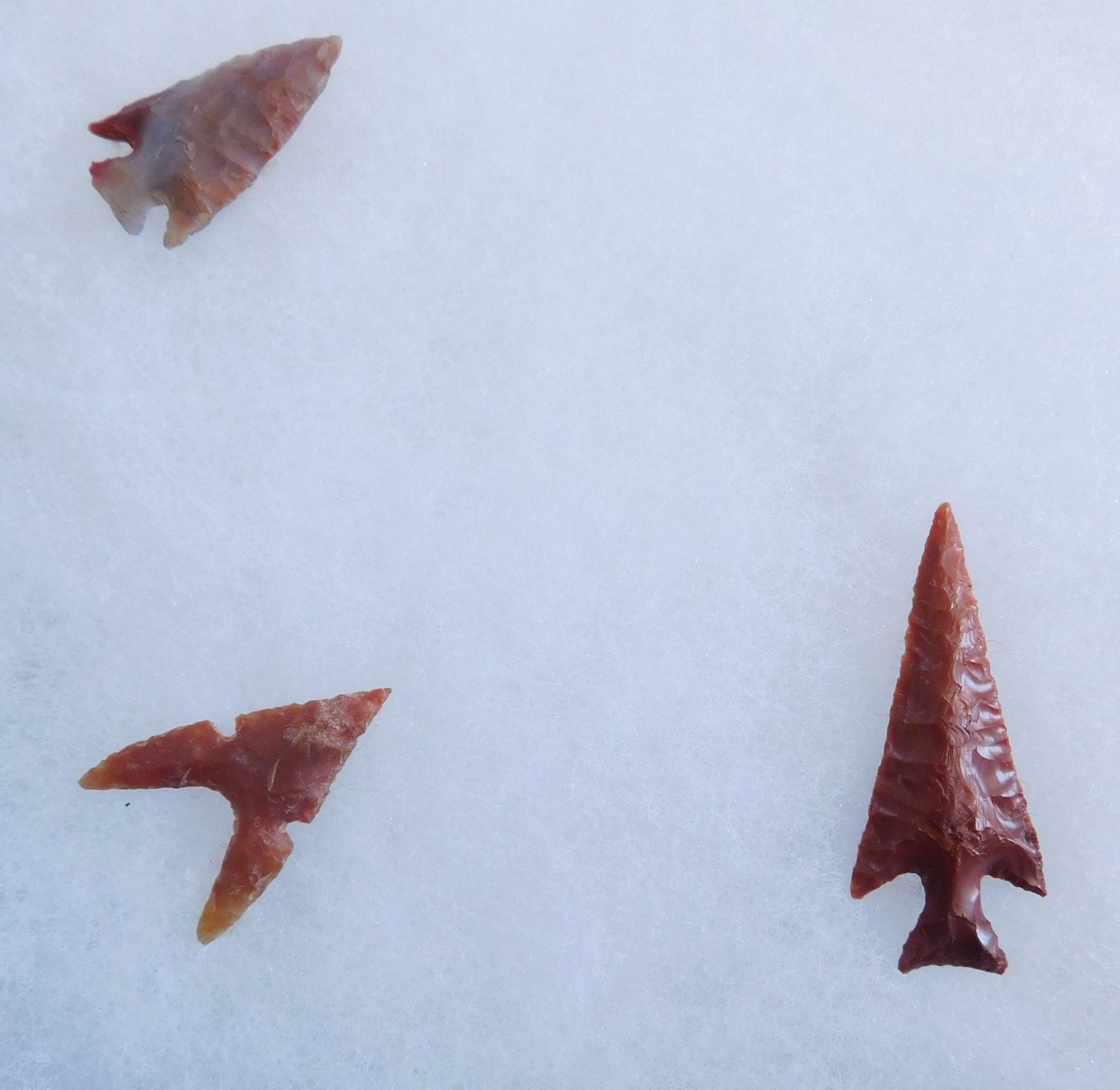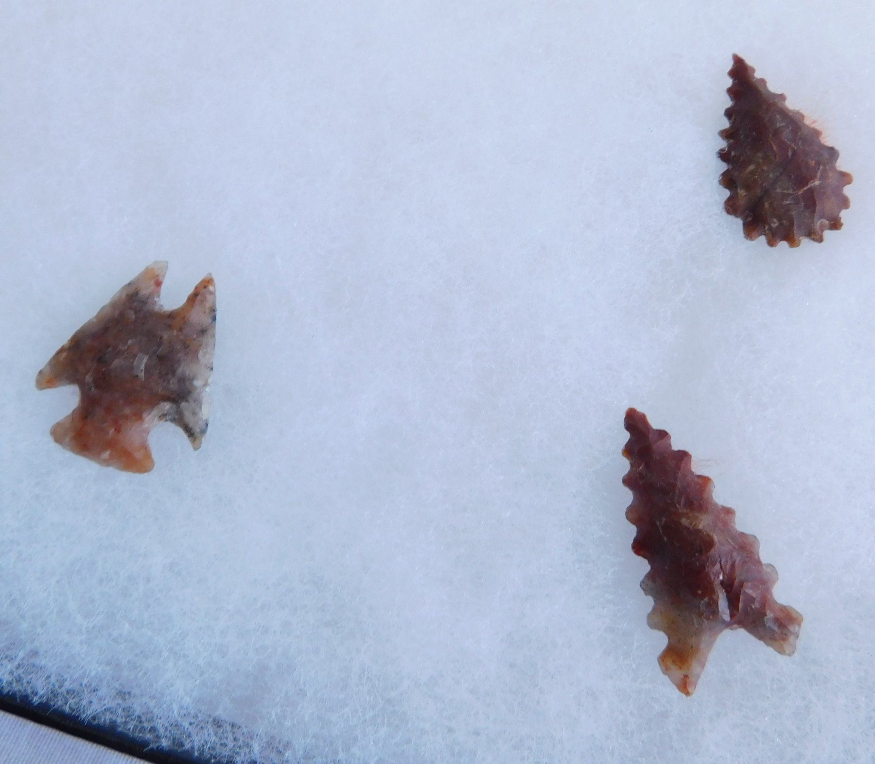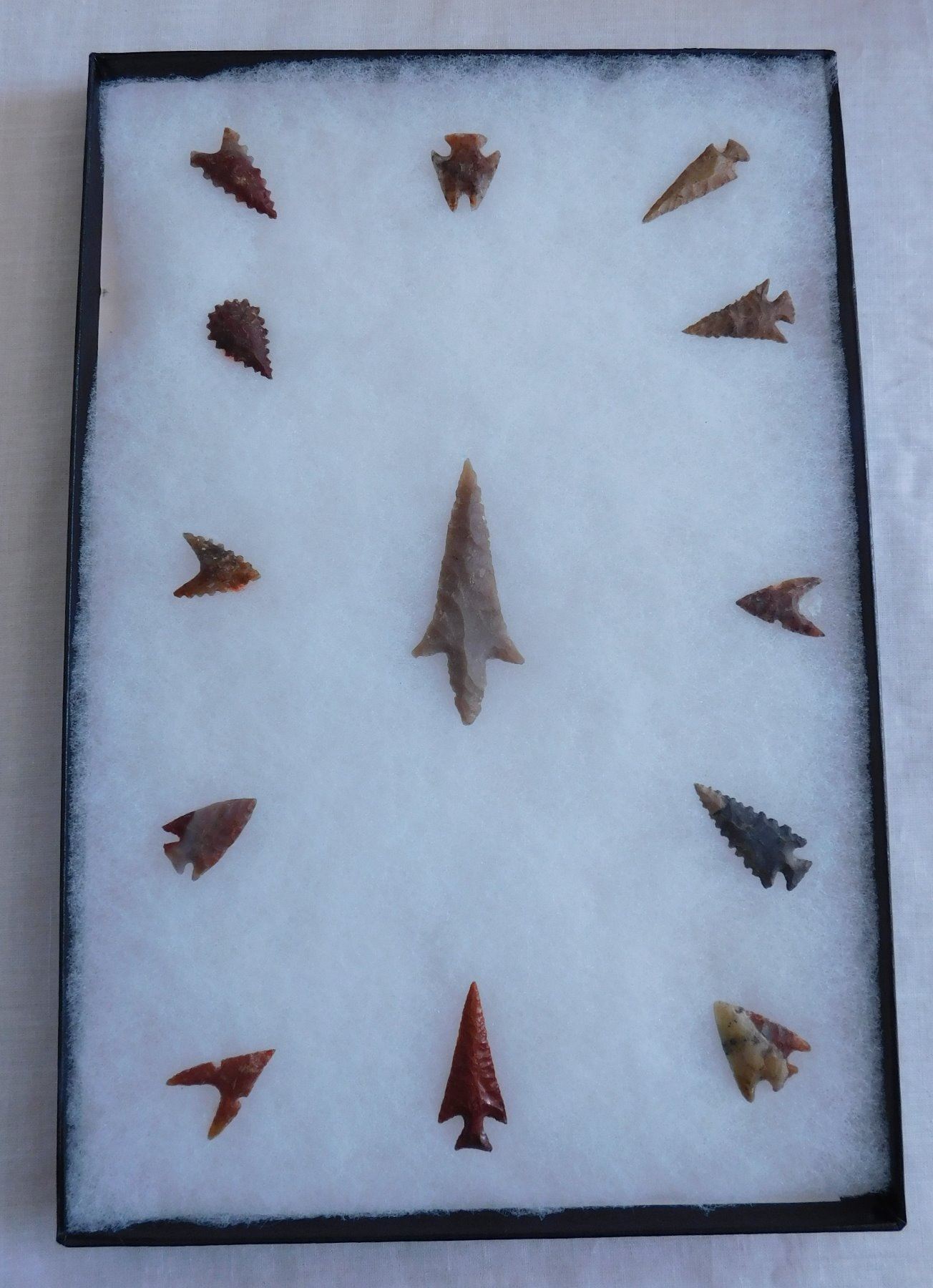 Illinois Flint Collection, pre-historic items. Made of chert, the items measure from 1" to 2.75" long. Adams County, Illinois. Frame not included. Condition: As found, see images. Shipping: $20.50 w/insurance and signature.