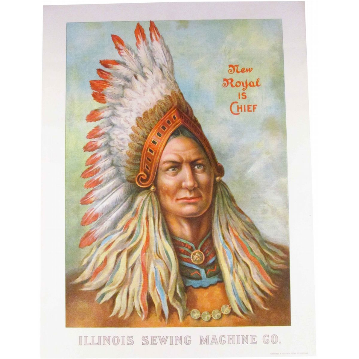 Illinois Sewing Machine Co. Paper Sign. Depicting The New Royal is Chief. Edwards & Deutsch Litho. Co. Chicago. Very minor discoloration at 12:00 otherwise near mint condition. 16 X 21 inches.