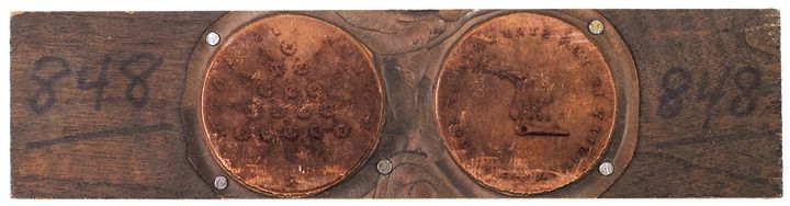 Consists of a copper rendering of the front and back of a Kentucky Token, attached to a small wooden block measuring 1.25” x 5”. This was used in the printing process to illustrate a book on coins. The “images” show a half-tone dot pattern. The surfaces appear to be in good, usable, and printable condition.