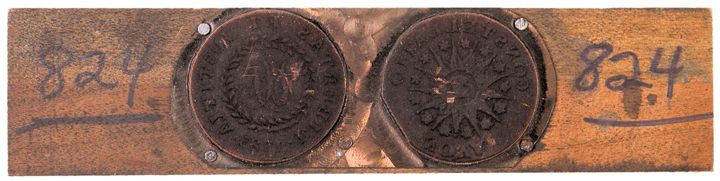 Consists of a Copper rendering of the front and back of a 1783 Nova Constellatio Copper, which is attached to a small wooden block measuring 1” x 5”. This was used in the printing process to illustrate a book on coins. The “images” are show a halftone dot pattern. The surfaces appear to be in good, usable, and printable condition.