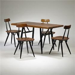 Ilmari Tapiovarra Pirkka dining table and chairs Asko Finland, 1955 pine, ebonized wood 47"w x 27"d x 26"h This dining set features many fine details: a split seat, tapering splayed legs, and through-tenon joinery. Branded marks.