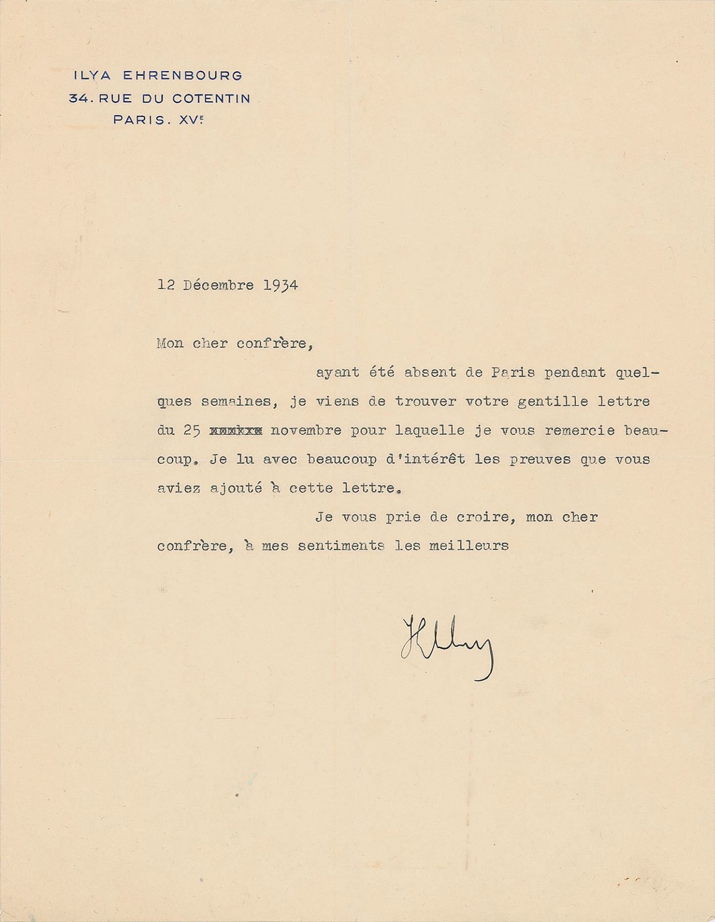Jewish Soviet writer, Bolshevik revolutionary, journalist, and historian (1891–1967). TLS in French, signed “I. Ehrenburg,” one page, 8.25 x 10.75, personal letterhead, December 12, 1934. In part (translated): "Having been away from Paris for a few weeks, I have just found your kind letter…for which I thank you very much. I read with much interest the proofs you had added to this letter." In fine condition.