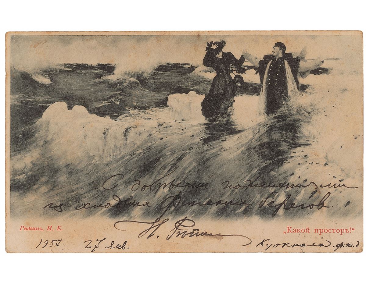 Russian painter (1844–1930) of the Peredvizhniki artistic school, known for his realistic, psychologically intense works. Desirable postcard depicting Repin’s painting entitled ‘What Freedom!,’ 5.5 x 3.5, signed and inscribed on the front in Cyrillic, adding the date of 1907. Addressed on the reverse in another hand and sent to a woman in Rio de Janeiro. In fine condition, with light foxing and moderate contrast to the inscription against the dark image. Painted in 1903 before the Russian Revolution, Repin’s painting portrays two enthusiastic students holding hands as they rise above the ocean, greeting the unlimited expanse ahead with the stroke of a hand.