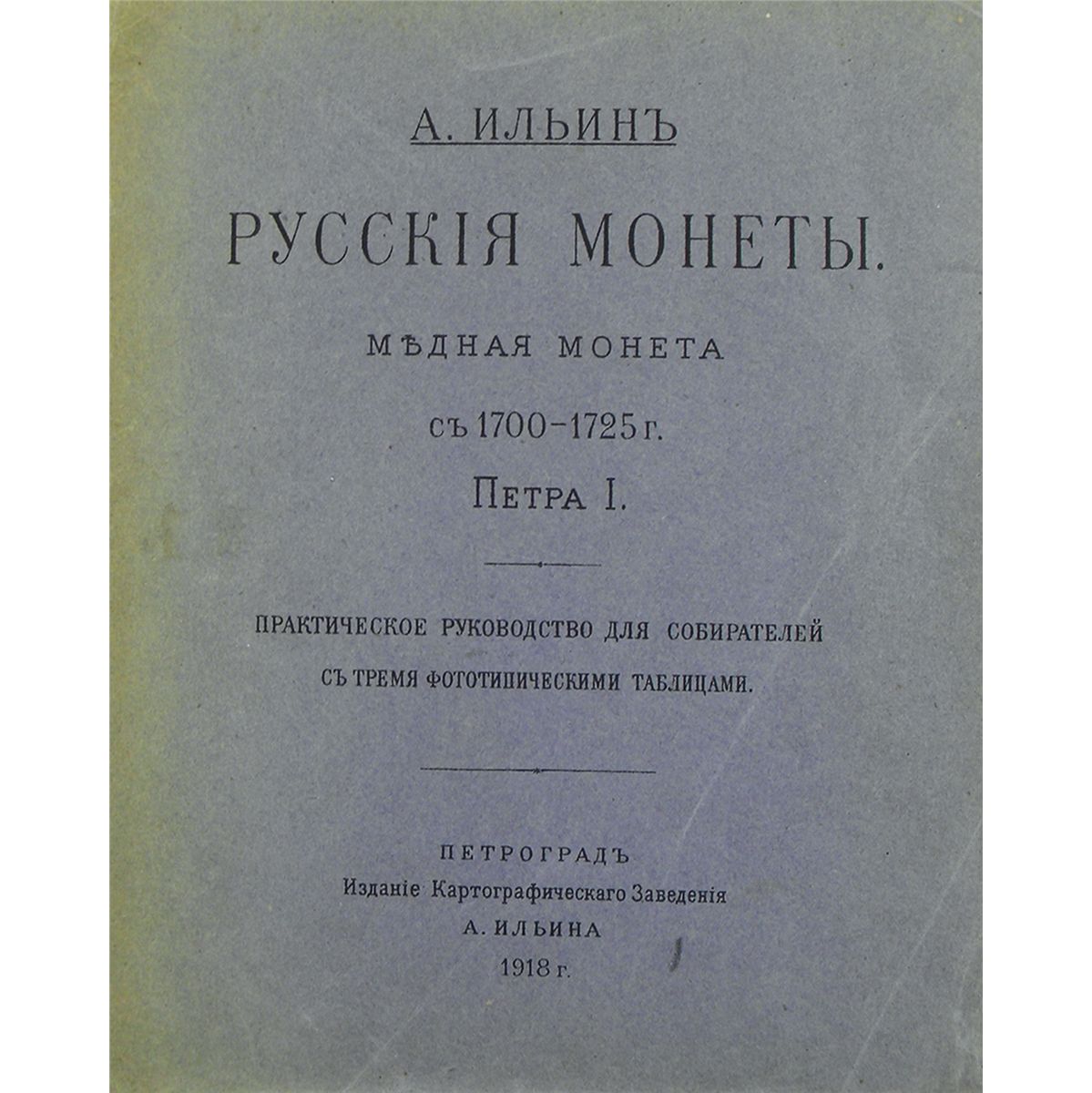 Ilyin, A.РУССКIЯ МОНЕТЫ. МѢДНАЯ МОНЕТА СЪ 1700–1725 Г. ПЕТРА I. I. Petrograd, 1918. 8vo, original printed wraps. 62 pages; 3 fine plates of coins. Wraps and extremities a bit worn. Very good. The rare original edition of this still-important work on the copper coins of Peter I. Clain-Stefanelli 11157.