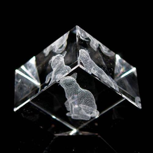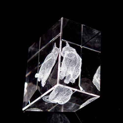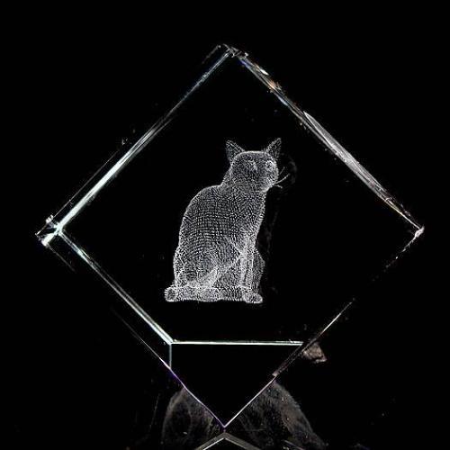 Image 3 Crystal "Laser Kitty" by Fyodor Lebedev, with a three-dimensional laser sculpture of a cat, in a crystal block, which is tilted, and resting on one flattened corner. Width 1 5/8".