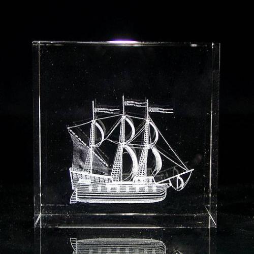 Image 3 Crystal "Spanish Galleon" by Fyodor Lebedev, a rectangular crystal paperweight, with a three-dimensional laser sculpture of a Spanish galleon. Height 3 3/16".
