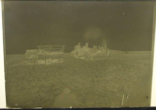 Glass image depicting farmers in field with machinery. Measures approximately 4 ½" x 4".