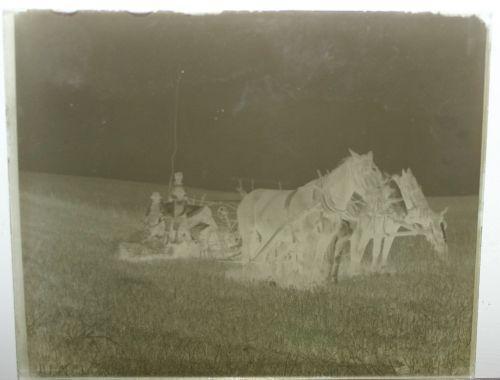 Glass image depicting farmers in field with horse drawn farm implement. Measures approximately 4 ½" x 4".