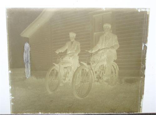 Glass image depicting two men in dusters astride their motorcycles in front of a house. Measures approximately 4 ½" x 4".