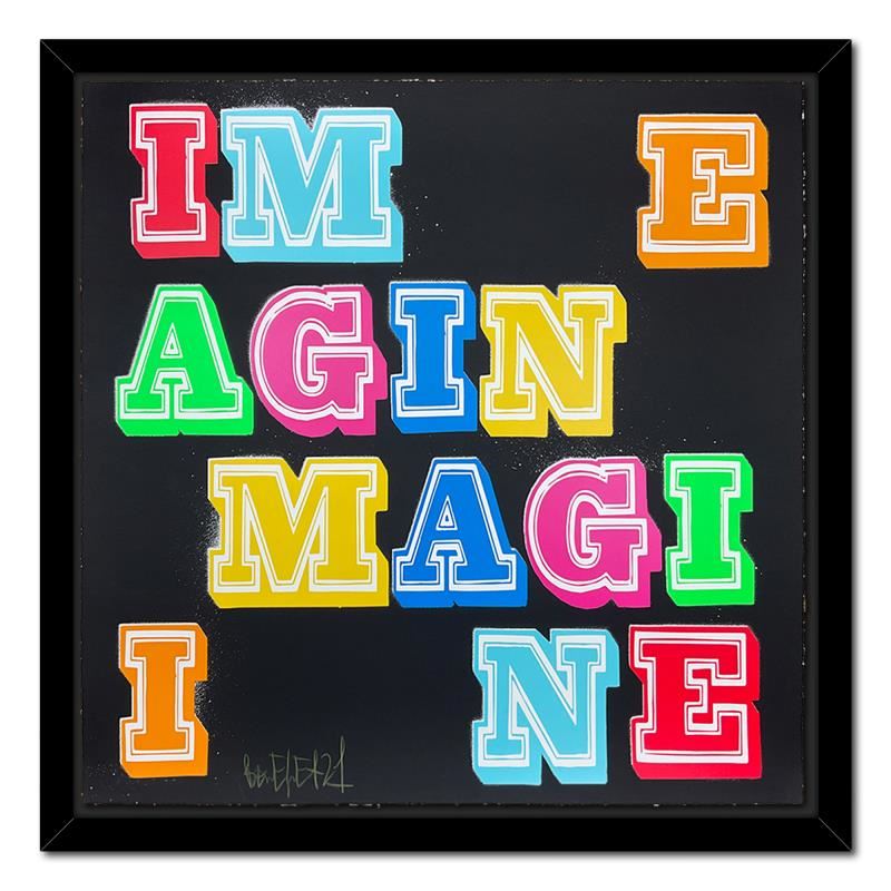 "Imagine" is a hand pulled limited edition screen print on paper with a spot varnish and hand deckled edges by Ben Eine. This piece is numbered and signed by the artist. Comes custom framed with Letter of Authenticity. Measures approx. 33.5" x 33.5" (frame), 27.5" x 27.5" (image).