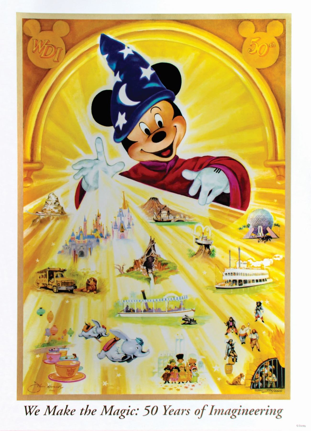 (Disneyland, 2002) A rare limited edition lithograph created to celebrate the 50th anniversary of Walt Disney Imagineering. Designed by Disney Legend John Hench, the lithograph features many of Disneyland's most iconic attractions and is numbered 994/6000. Measuring 28"x20", the lithograph is in good condition with a few minor creases and edge-wear. The original certificate of authenticity is included.