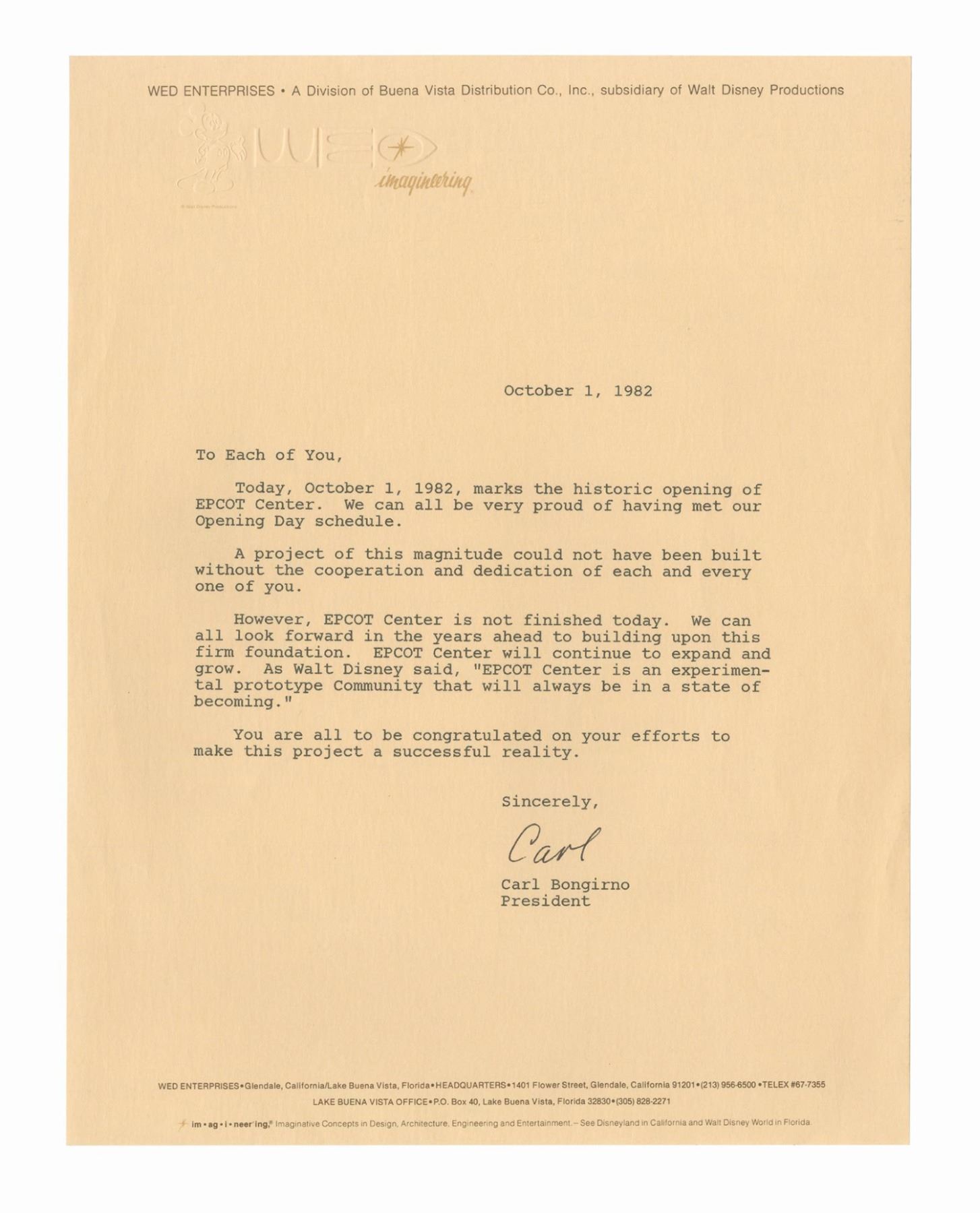 (Epcot, 1982) A congratulatory letter for the grand opening of Epcot Center from WED Imagineering president Carl Bongirno to the Imagineers who worked on the project. The letter is dated October 1, 1982 and typed on WED Imagineering letterhead stationery. Thanking everyone for their efforts in reaching this milestone, Bongirno states that the job isn’t done, and quotes the father of Epcot, Walt Disney: “’EPCOT Center is an experimental prototype community that will always be in a state of becoming.’” The letter is signed in black ink, “Carl.” Measuring 11”x8.5”, it remains in fine condition with minimal handling.