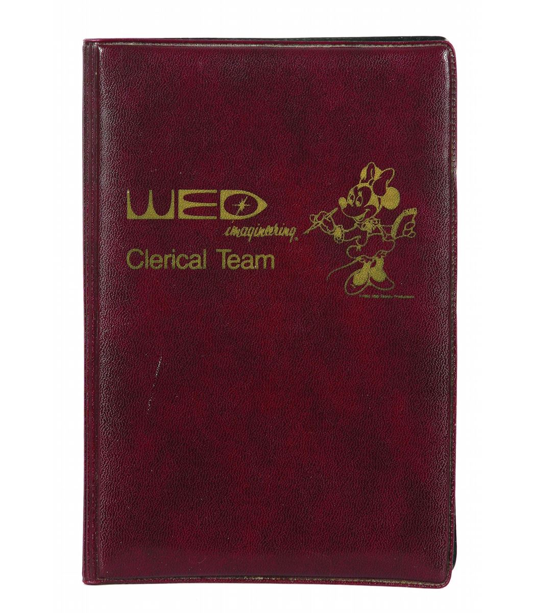 (WED, 1990s) An original WED Imagineering clerical notepad. The front cover features Minnie Mouse as a secretary next to the WED Imagineering name. Notepad within is unused. Measures 9.5”x6.5”. In good condition with mild wear and some small amounts of debris within.