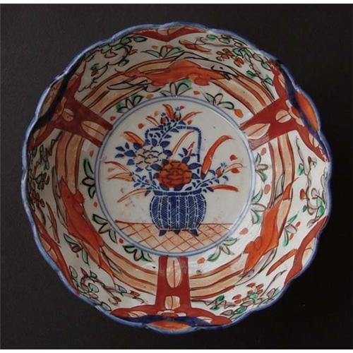 Colorful Imari ceramic bowl depicting dolphins, trees and a basket of flowers. Unmarked on the underside as older pieces often are. In good used condition as shown with paint loss and minor imperfections from the time of manufacture. Please ask questions, request additional photos and shipping costs before buying.