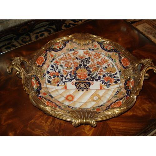 A Very Beautiful Japanese Imari Charger, Circa 1870, with Later Ormolu Mounts in pure Louis XV Style, Circa 1945, Created in Paris France.  The Charger is Decorated  in Bright and Vivid Colors of Rust, Iron-Red, Cobalt Blue and Touches of Celadon Green, in a pattern of Flowers and Vines in a Classical Shaped Vase with Birds and other elements all contained in an Elaborate and Complicated Border, with the Underside of the Charger decorated to compliment the front. Deeply cut and Cast Louis XV style mounts in an almost Rococo feel lend the whole an aire of Glamour and Sophistication.  Perfect Condition throughout.