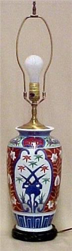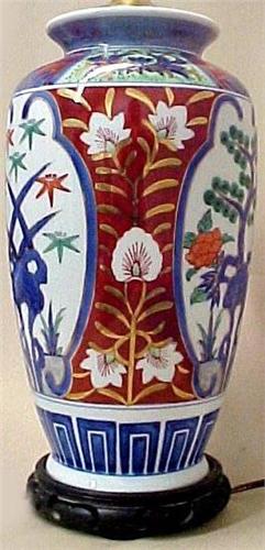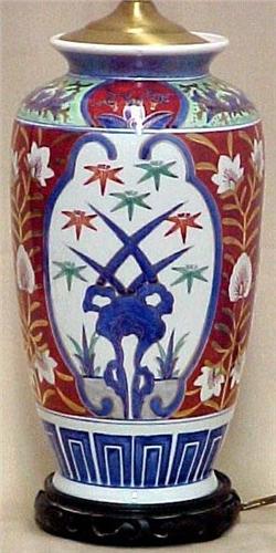 Imari lamp; vase form; polychrome decoration on white ground; on carved rosewood base; 13 1/2" high (to top of porcelain); mid 20th C.