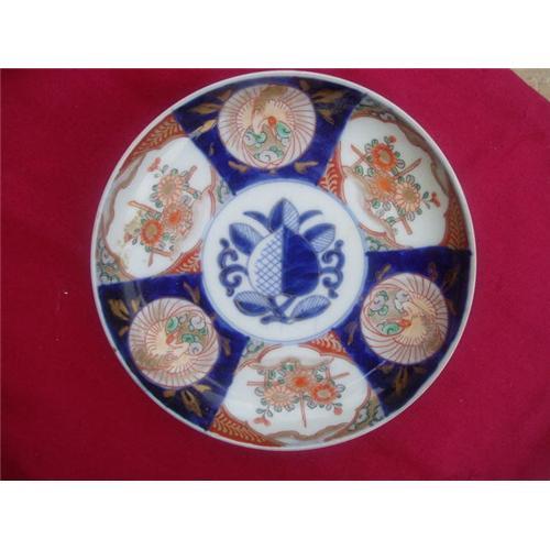 This is a nice, heavy Imari bowl or plate with a nice ring. I do not know the exact age so I am saying 1940 but it may be older. There is a stamp on the bottom. The plate boasts the traditional colors of cobalt blue, red, and orange on white. There is a center medallion which adds beauty to the piece. Most of the gold gilt has been rubbed off the edge due to age. There is plenty of gold gilt left on the interior of the bowl. This piece has no cracks, chips, or restorations and is in very good condition. Please send your zip code if you would like a shipping quote. Thank you for viewing!