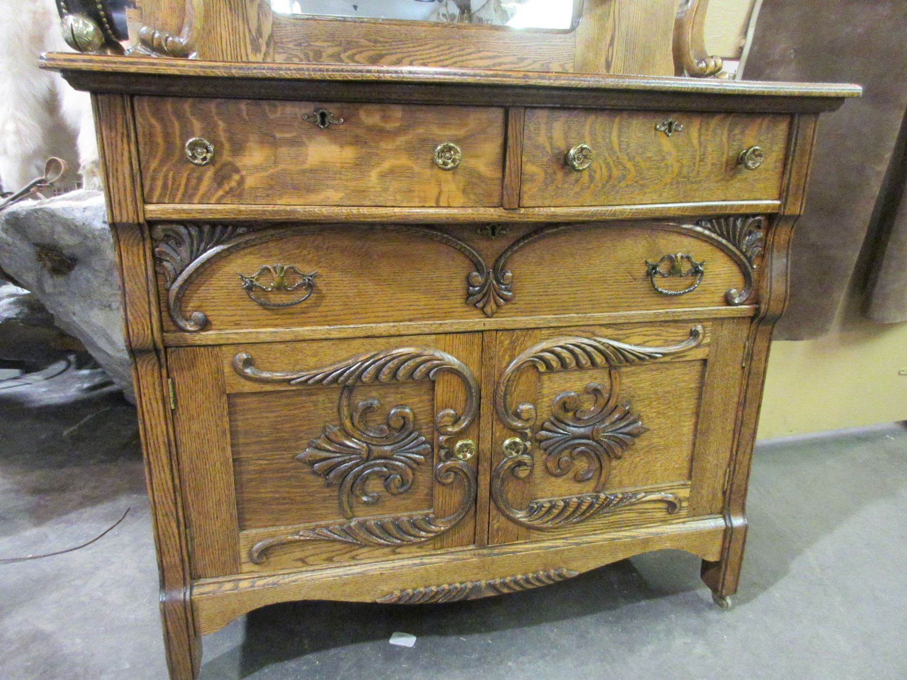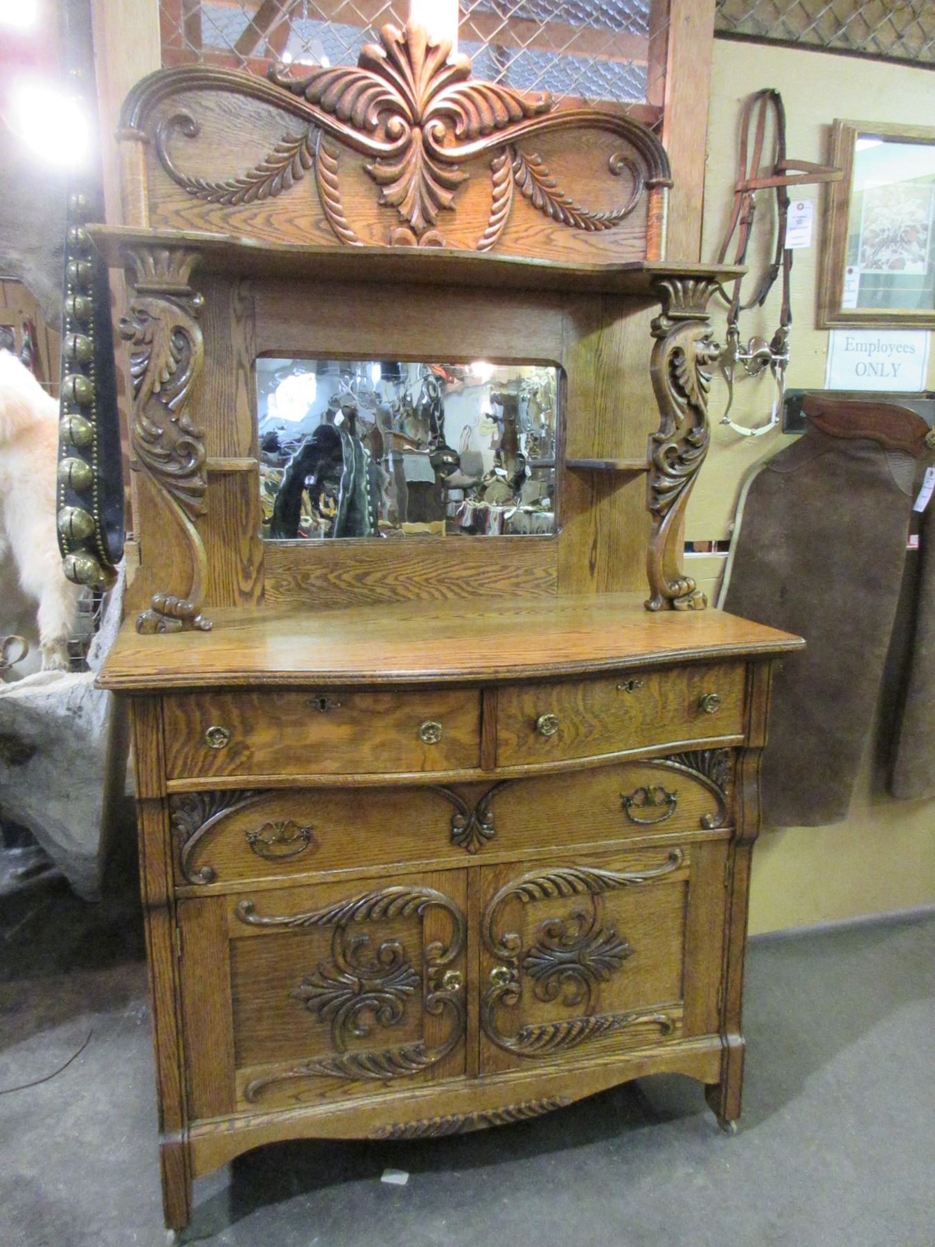 Immaculate Oak Buffet- Mirrored Back With Shelf- Extensively Carved- Original Hardware- Lion Heads- Casters- 80"H X 43"W X 21"D
