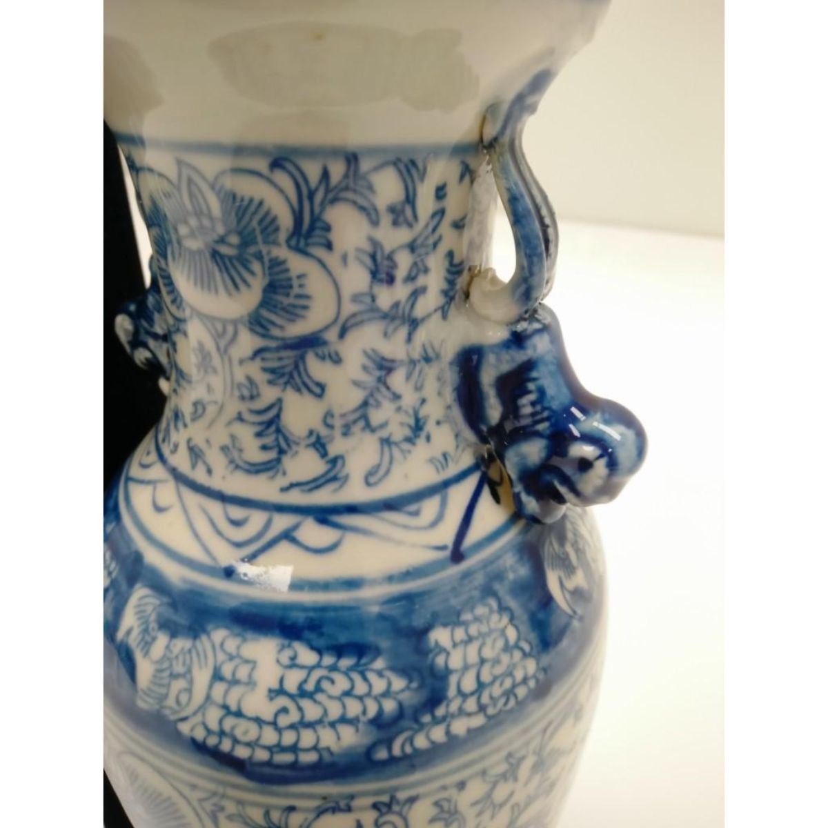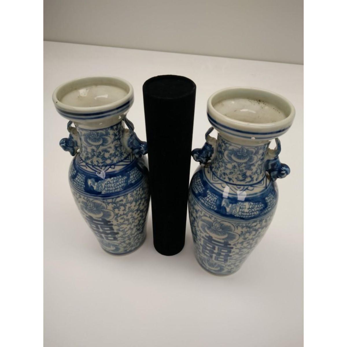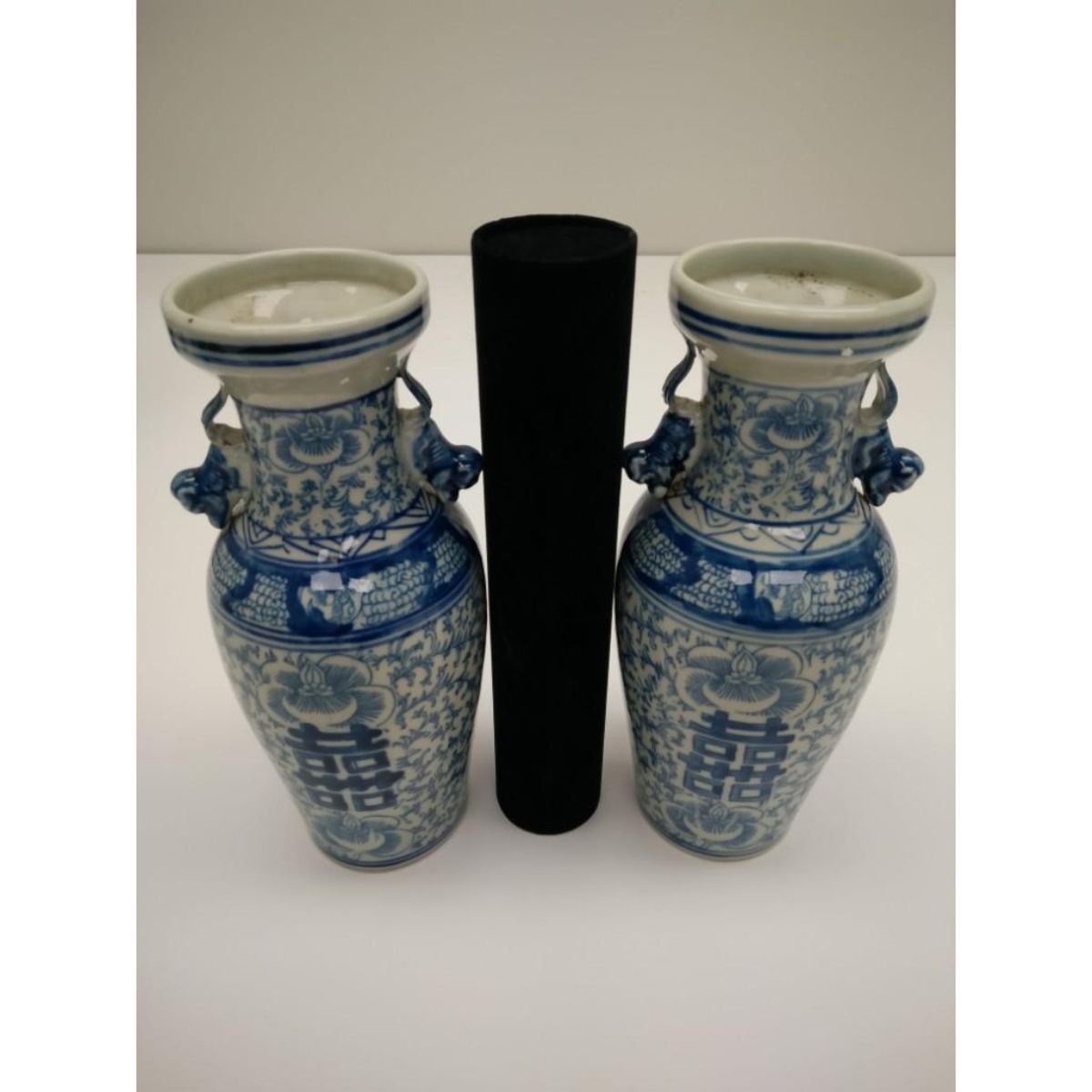 Up For Auction Is An Immaculate Pair Of Hand Painted Porcelain 'Happiness" Vases This vintage vase has the classic "Happiness" motif ( a traditional wedding theme, dated from the late Q'ing dynasty circa 1880). Use: Decorative Vase Material: Porcelain, Ceramic Color: White, Blue Make: Hand-crafted, Hand-painted Origin: China Dimensions: W 5" H 11" Attributes: Decorative Object, Words and Symbols, Flowers and Plants