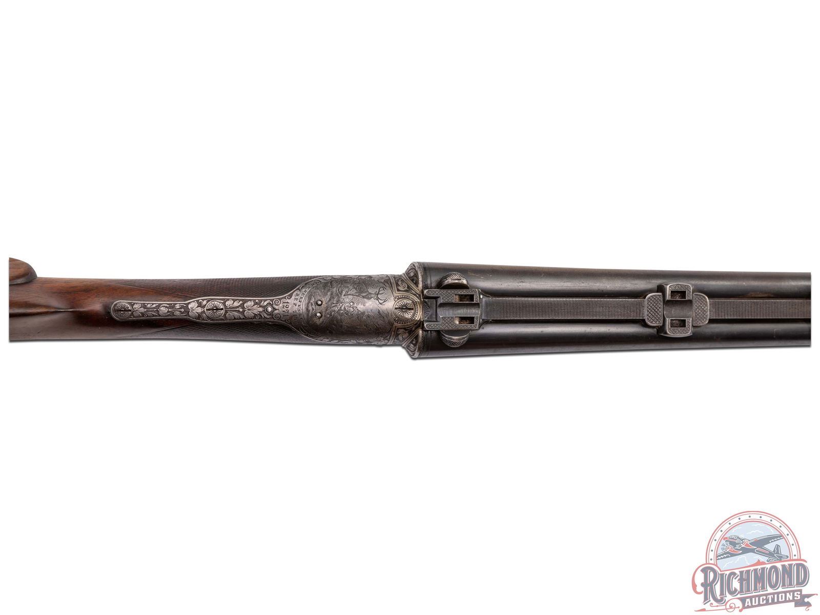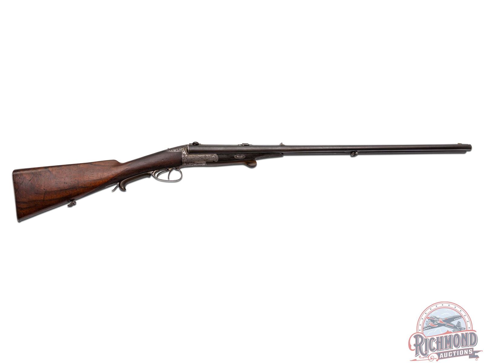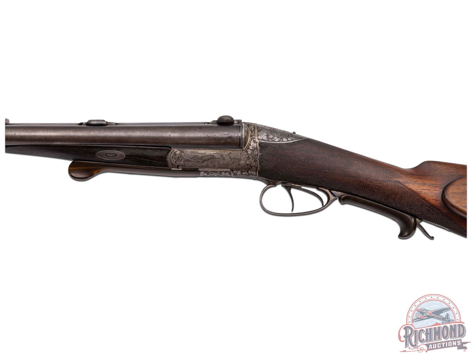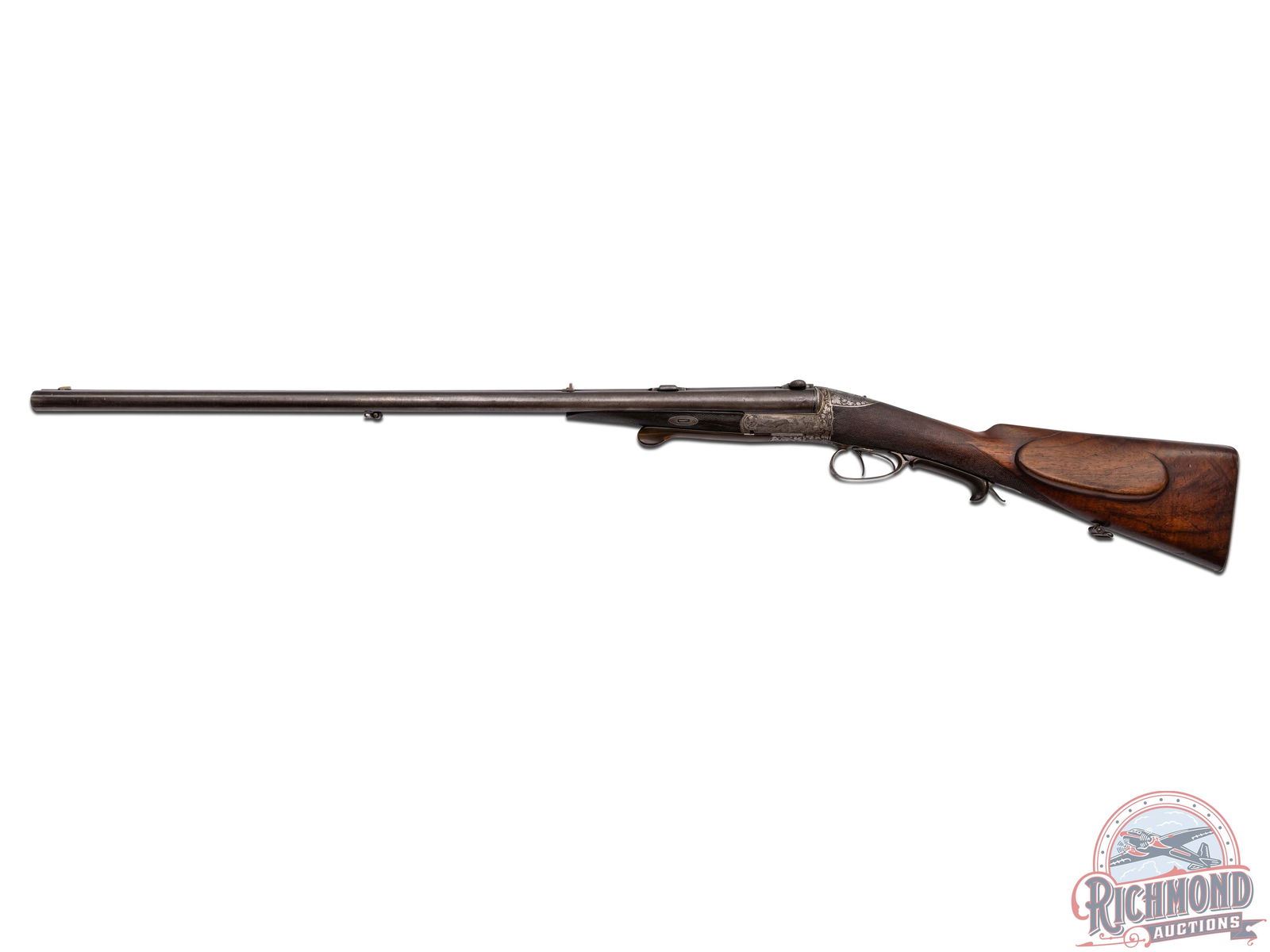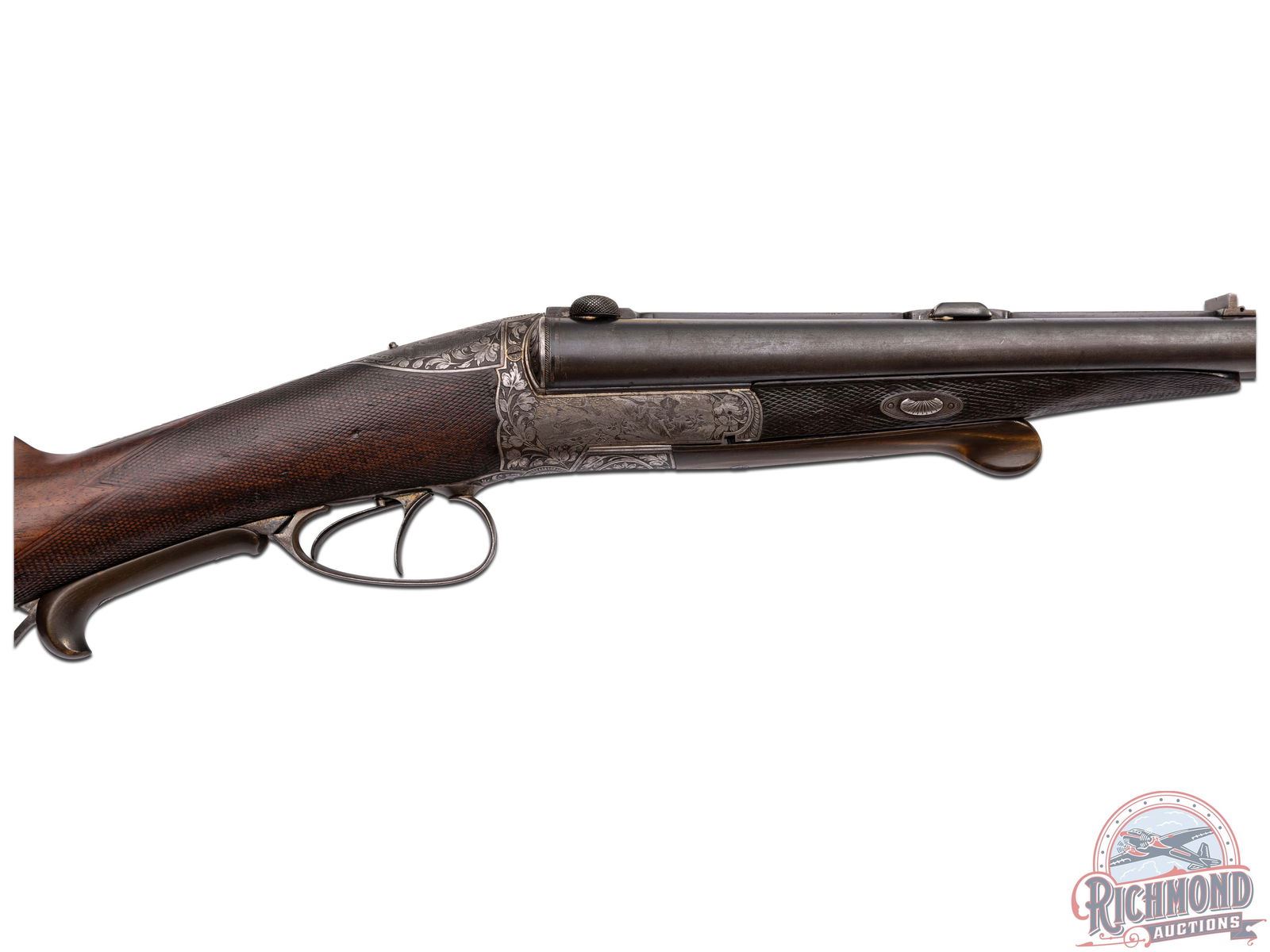 Made in Suhl, Germany by Imman Meffert, circa 1910. 27-1/2" Damascus 16 gauge barrel beside fluid steel 8x72R caliber steel rifle barrel with matted rib with maker marking, rifle sights, claw scope bases, and extractors. Underlever Oak leaf and game scene engraved action with Meffert patented "Grip Safety" with double trigger (front trigger is a set), cocking indicators, and steel trigger guard. Walnut checkered stock with checked splinter forearm with horn opening lever. LOP: 14". DAC: 1-1/4". DAH: 2-1/4". CALIBER: 16/8x72R. S/N: 397. FFL STATUS: Curio & Relic.