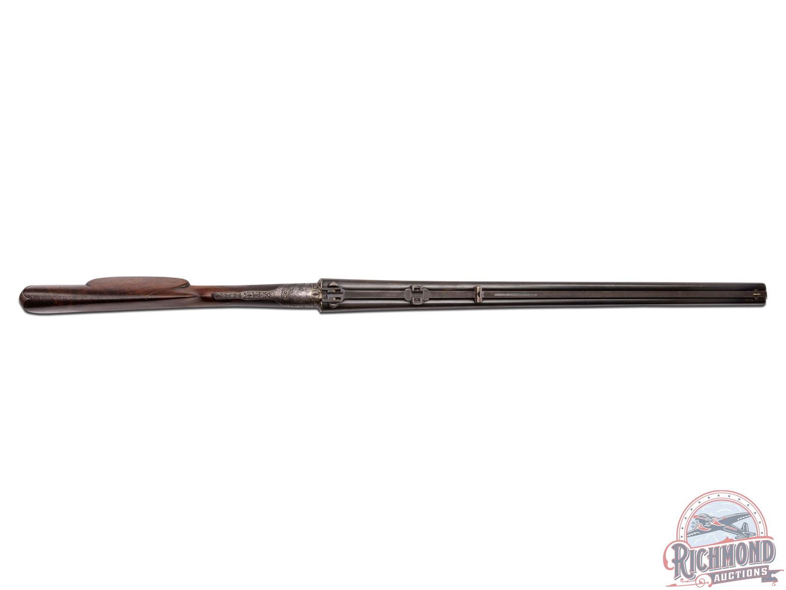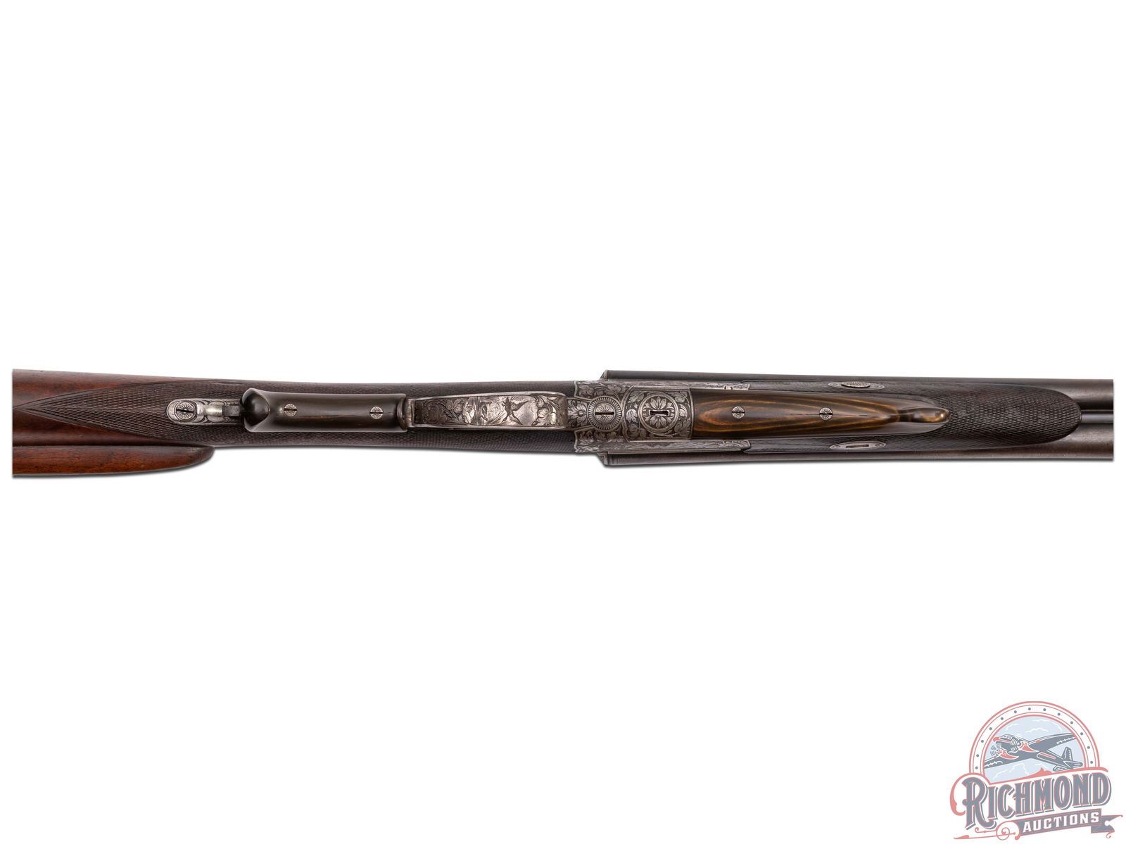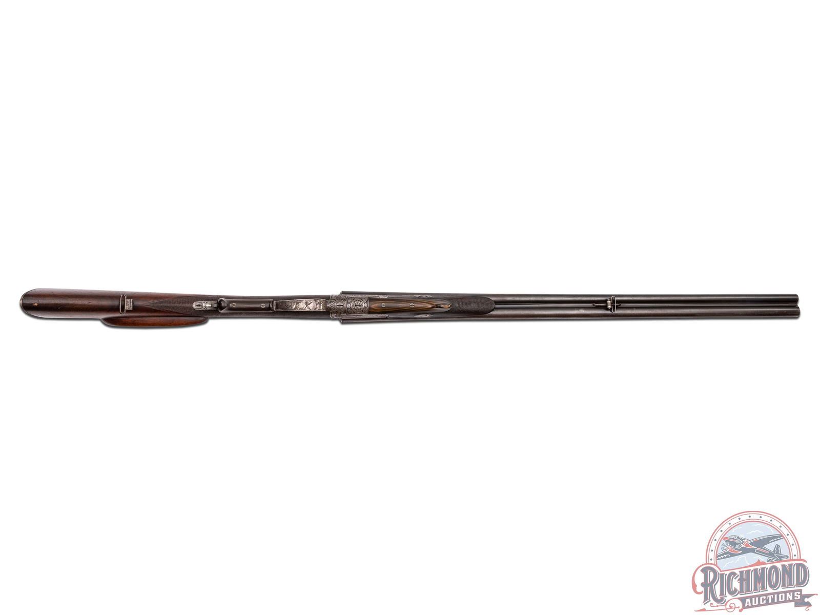 Overall 80% fading barrel blue and Damascus scene with areas of brown patina. Action has faded to a silvery brown. Wood has traces of finish with checkering worn flat. Stock has one crack on comb peak. Good bores and mechanics.