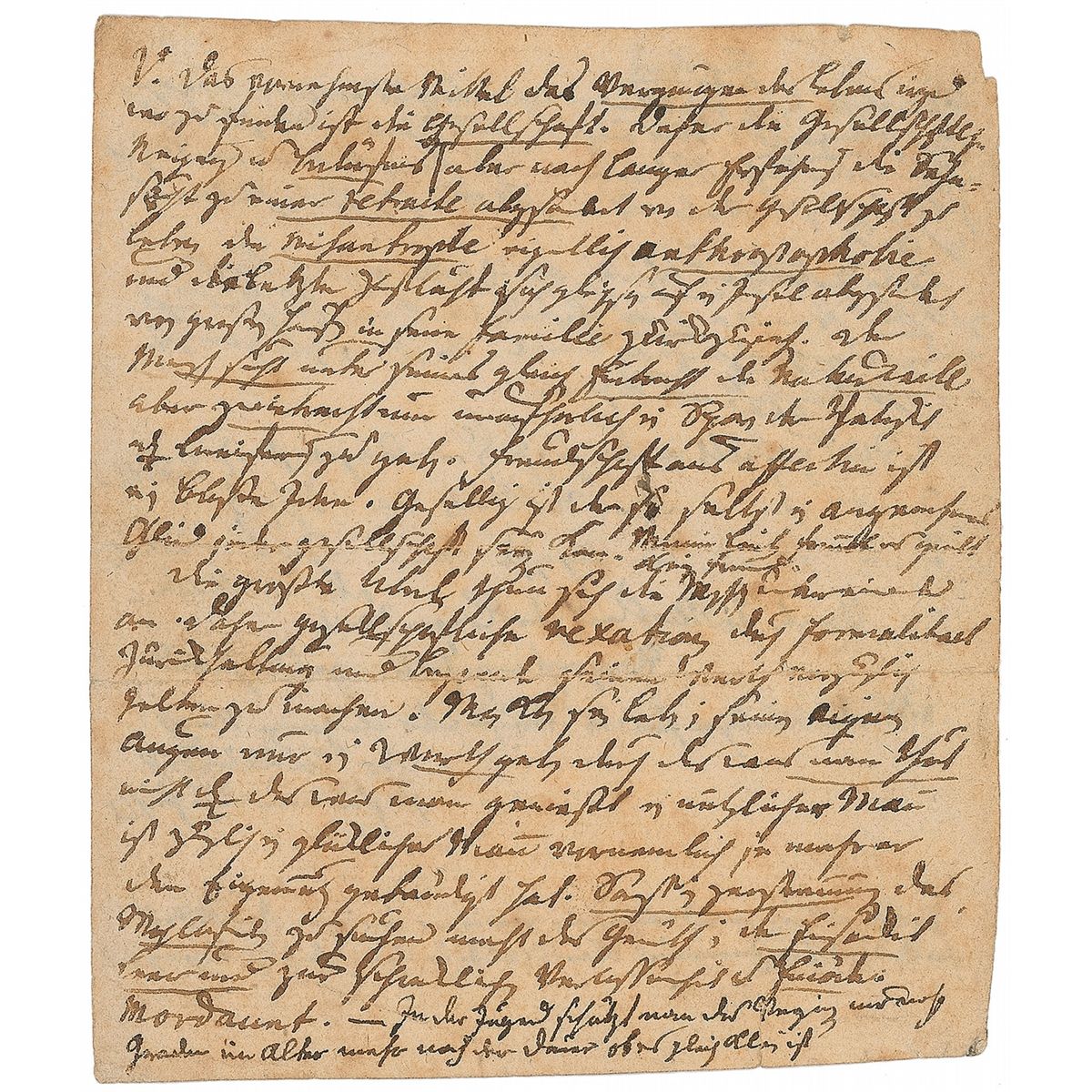 Excessively rare handwritten manuscript in German, unsigned, one page both sides, 4 x 4.5, no date but circa 1766. Kant pens his thoughts on society, taste, and aesthetics. In part (translated): “V. The most important means of finding anywhere the happiness of life is society. Hence originates the need for society, but after having experienced it for a long time, there comes the longing for retreat, to be secluded from society…Man is seeking unity with other people, whereas nature wants discord in order to spur incessant action. Friendship resulting from affection is a mere idea. He is sociable who can be a pleasant part of any society. My dear friends, there is no friend…One can only live a useful life in one’s own eyes by acting, not by enjoying. A useful man is at the same time a happy man, especially if he has restrained his self-interest. If one is used to seeking happiness in distraction, the mood becomes empty in solitude and a horrible wasteland…All that is pleasing without any interest is beautiful. All that interests us, but only insofar as it is created by the subject itself, is good. All that is pleasing for objective reasons is beautiful.” Scattered foxing and toning, otherwise fine condition. Accompanied by a small offprint article by Arthur Warda.
