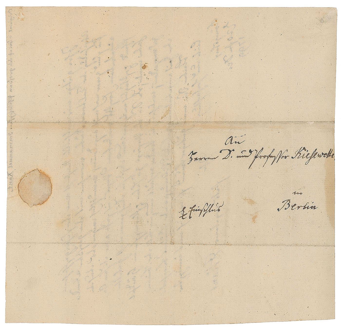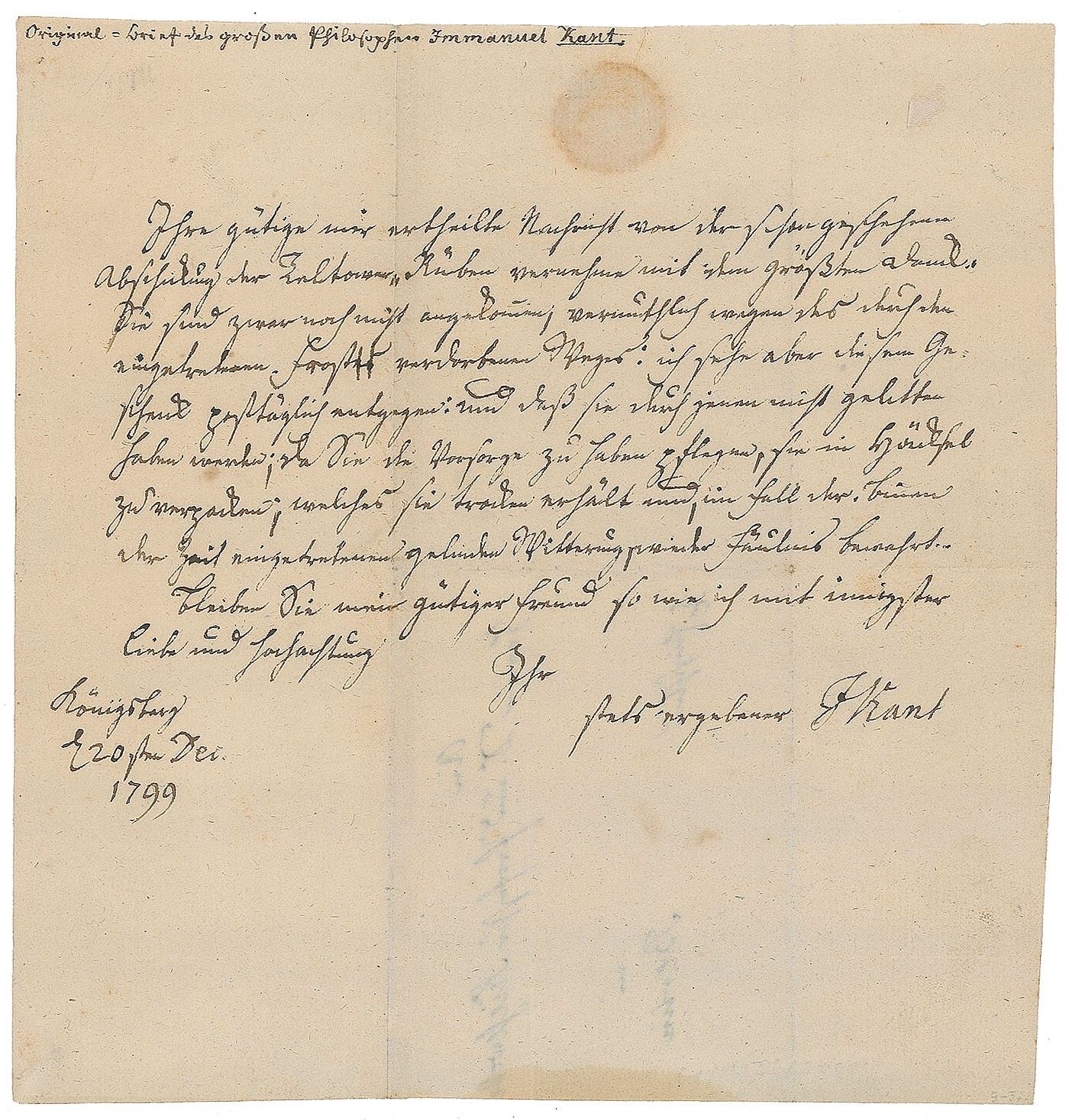 Central figure of modern philosophy (1724–1804) best known for The Critique of Pure Reason. Extremely rare ALS in German, signed “I. Kant,” one page, 7.5 x 7.75, December 20, 1799. Letter to his friend and pupil Johann Gottfried Kiesewetter, in part (translated): "Your well-informed message to me of the dispatch of the Teltow turnips was received with the greatest thanks. They have not arrived yet; presumably because of the path ruined by the frost, but I look forward to this gift on a daily basis." In fine condition, with trimmed edges and a light stain at the bottom. Kant's letters are exceedingly rare, this being the first we have offered.