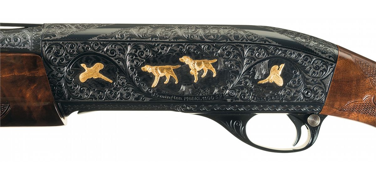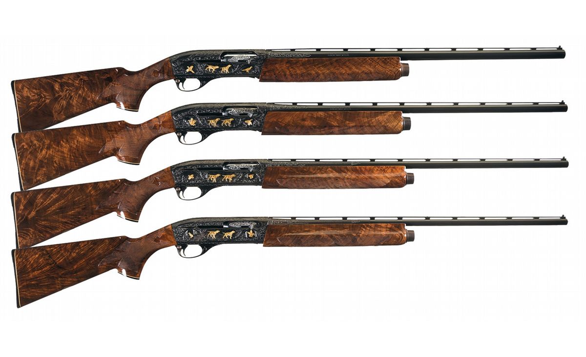Manufactured in 1977, this set of 4 Remington 1100 Shotguns was ordered for an individual initialed "AFT", and each shotgun in the lot received the care and attention of Remington's Custom Shop. At the Premier Grade, the 1100 becomes a hand-fitted masterwork, with two of the shotguns receiving the personal attention of Robert P Runge, a second-generation American engraver who started his career on Parker shotguns, one by an unidentified engraver who signs "JHC", and another by Leo Walter Bala, an apprentice of Runge who grew to become a Remington Master Engraver in his own right. Information provided by Mr. Bala to the Remington Society of America indicates the average time to perform the decoration of a Gold Inlaid Premier was 80 hours per weapon, entirely apart from woodwork or the individual hand-fitting performed on all Custom Shop arms; these shotguns represent a collective 2 months of labor from some of the best engravers of the era. The A gun is fitted with paired white and nickel beads on the barrel rib, with 3 3/4 inch wedges of scroll and punch dot engraving on either side of the chamber, with the choke measuring "cylinder" and a 2 3/4 inch chamber. The receiver shows near full coverage scroll and punch dot engraving, with the serial number and "REMINGTON MODEL 1100 SF" in banners on the left, "RPR 77" concealed among a field scene on the left, and a pair of golden game birds flanking a pair of hunting dogs on each side, all set into woodland and plains scenes. Superb extra-fancy walnut stock, with a checkered beavertail forearm and pistol grip, a Remington Presentation Model solid buttplate, a golden circular panel on the underside initialed "AFT" and a length of pull of 14 inches. With a green plastic case containing takedown sleeves and a magazine plug, which fits in a Remington Custom Shop sleeve numbered to match this gun.