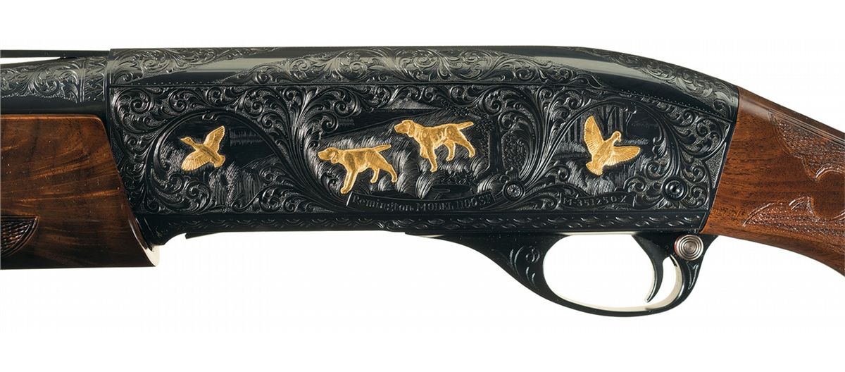 Manufactured in Remington's Custom Shop, the configuration and embellishment of this shotgun is a near match for the "A" shotgun, with the choke measuring "full", a 13 7/8 inch length of pull, and the signature on the left side of the receiver; "JHC". The identity of "JHC" has not been verified, but it may have been Jack Caswell, a Remington engraver-turned-salesman who returned to the Custom Shop during the era in question due to a shortage of trained engravers, with gold inlays of dogs and ducks. A green case, magazine plug, and matching Custom Shop box is also included with this shotgun.