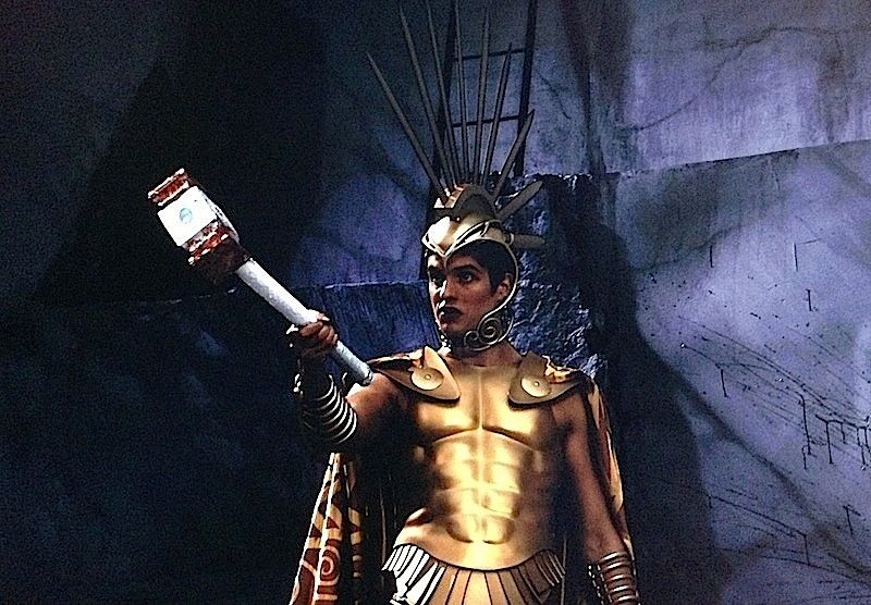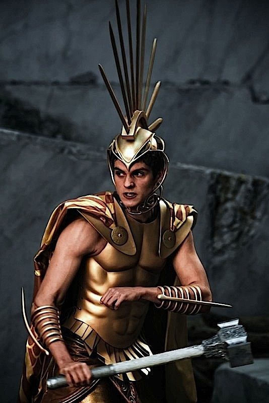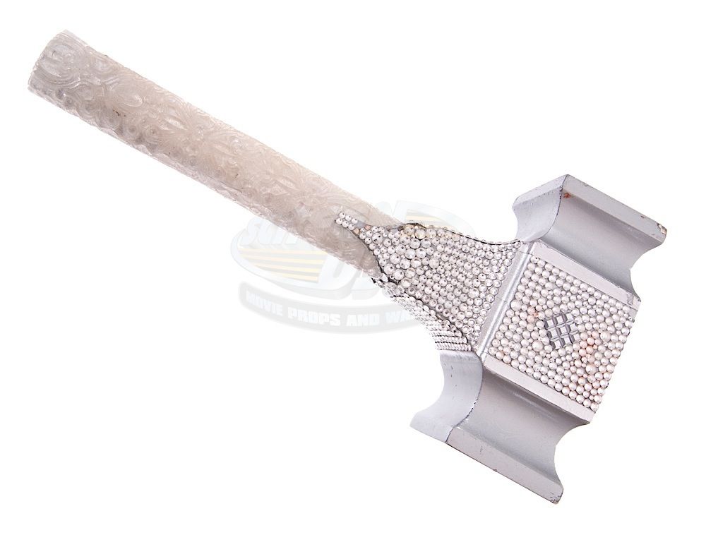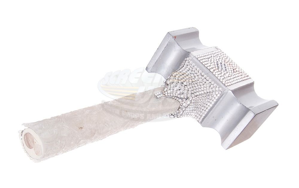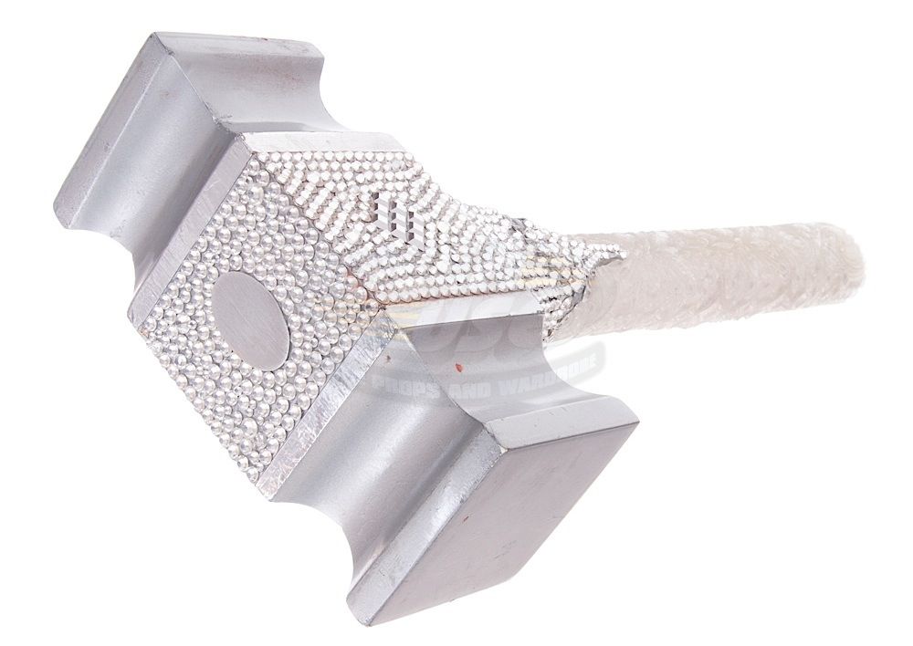 (Relativity Media, 2011) This prop hammer was custom-made by the production for use by Daniel Sharman as "Ares". The hammer is constructed of a resin handle and double-faced head. Silver colored plastic beads are applied to the head and top of the handle. Minor wear from use is present, measures 15" in length.