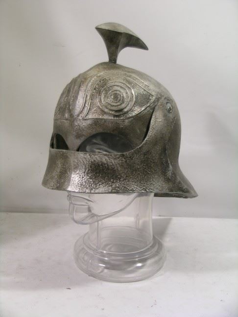 Hoplite Soldier screen worn, silver hard plastic with design on the front, spike on the top, visor on the front, custom battle helmet with foam inside. (approx. 19" long)